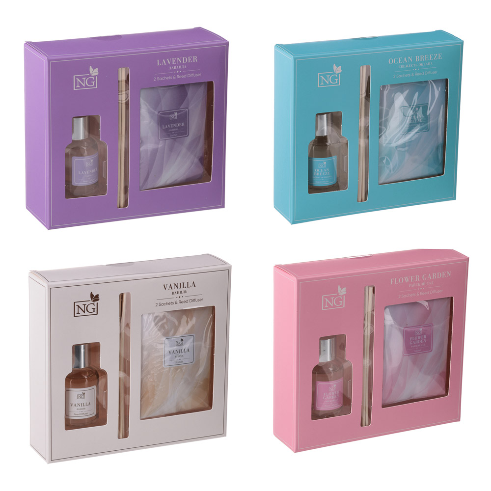 NEW GALAXY Набор ароматизатор-диффузор и саше 2шт., ваниль, райский сад, лаванда,океан 40мл, 10 г.