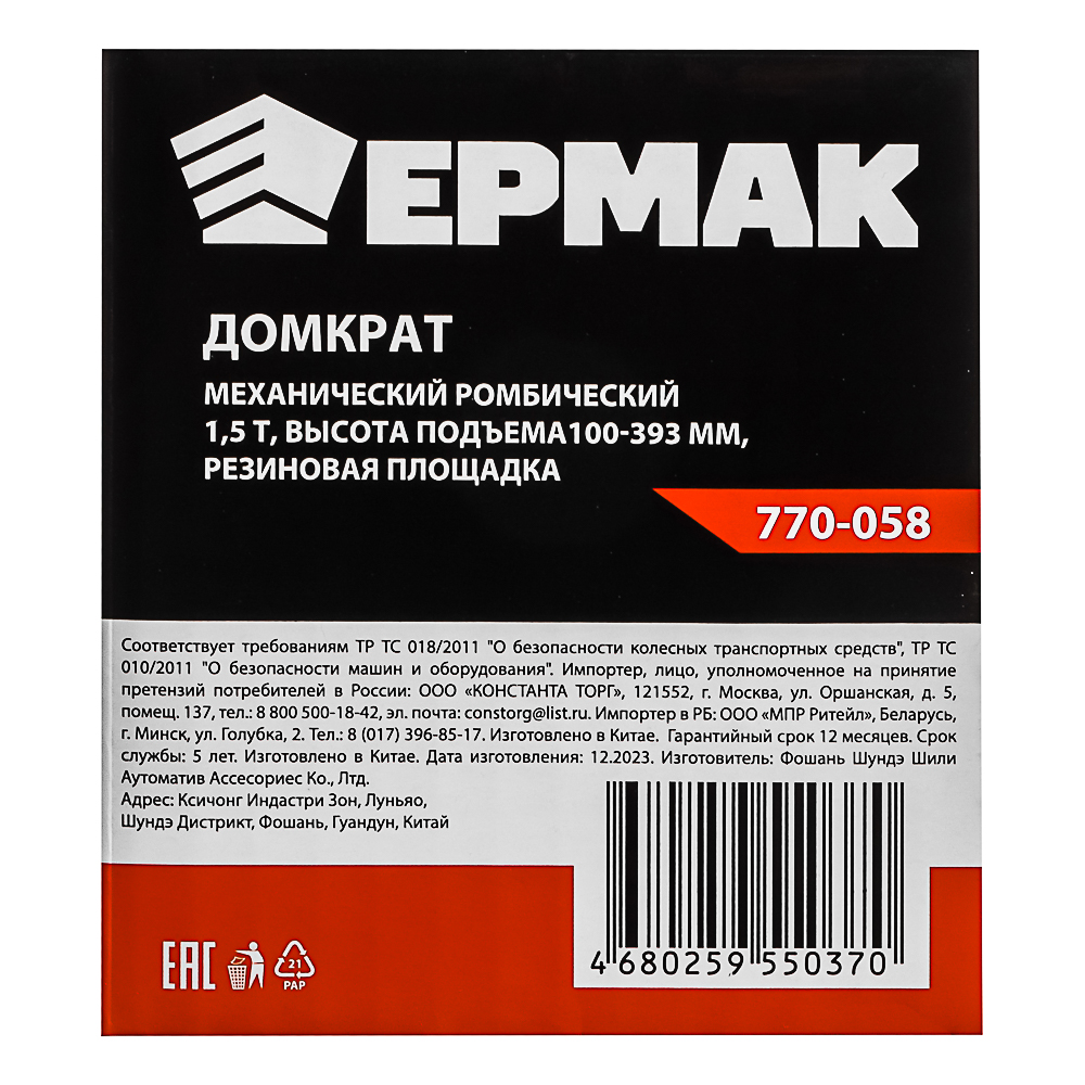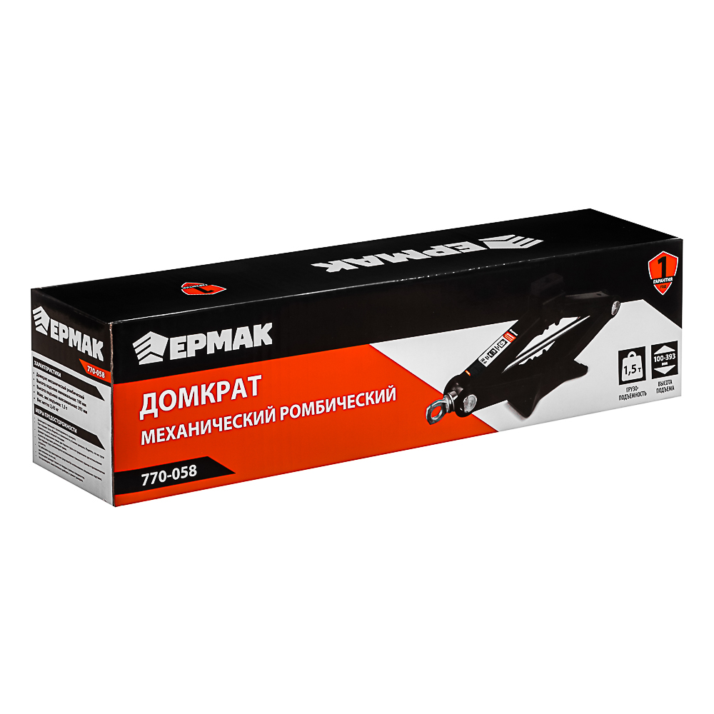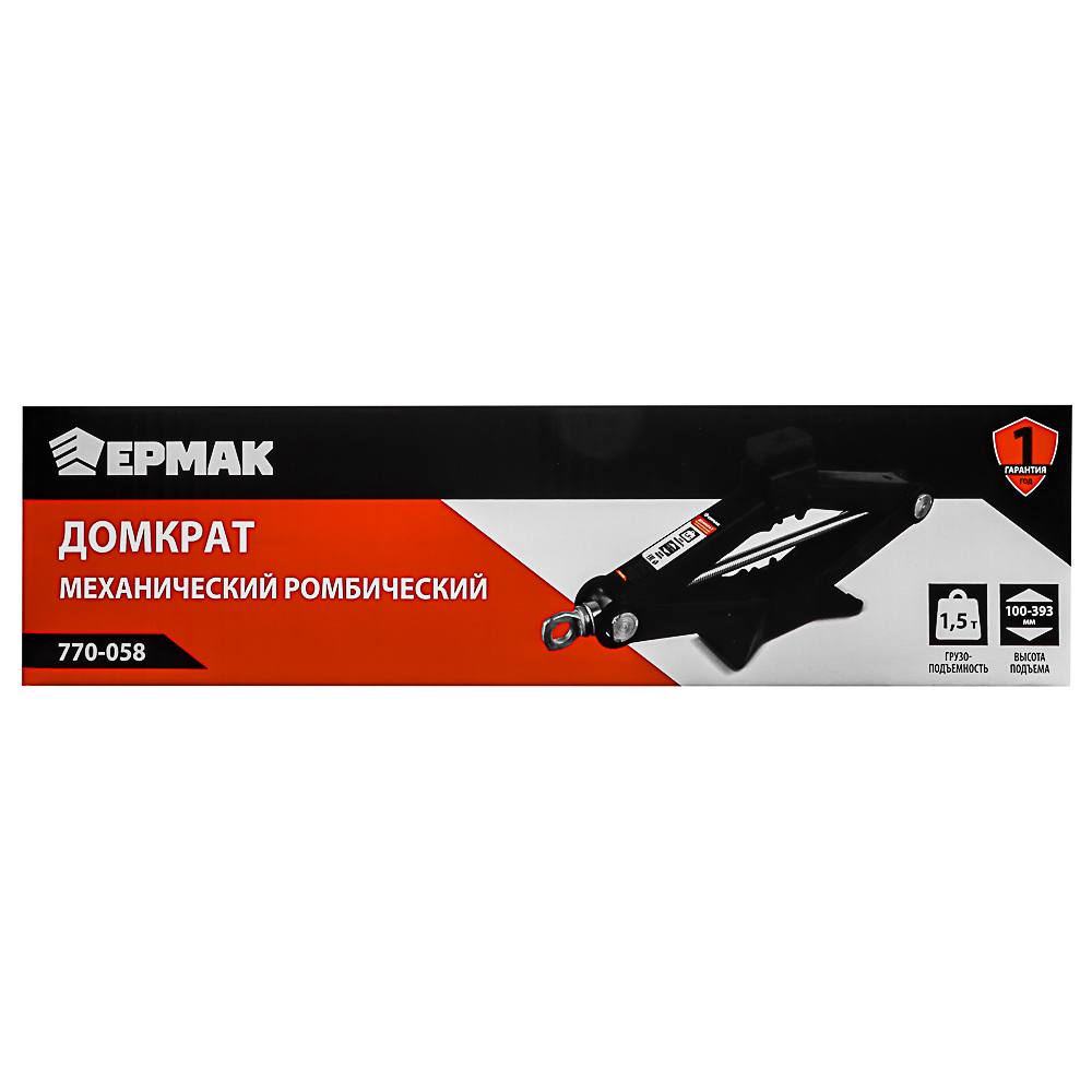 ЕРМАК Домкрат механический ромбический 1,5т, высота подъема100-393мм, резиновая площадка