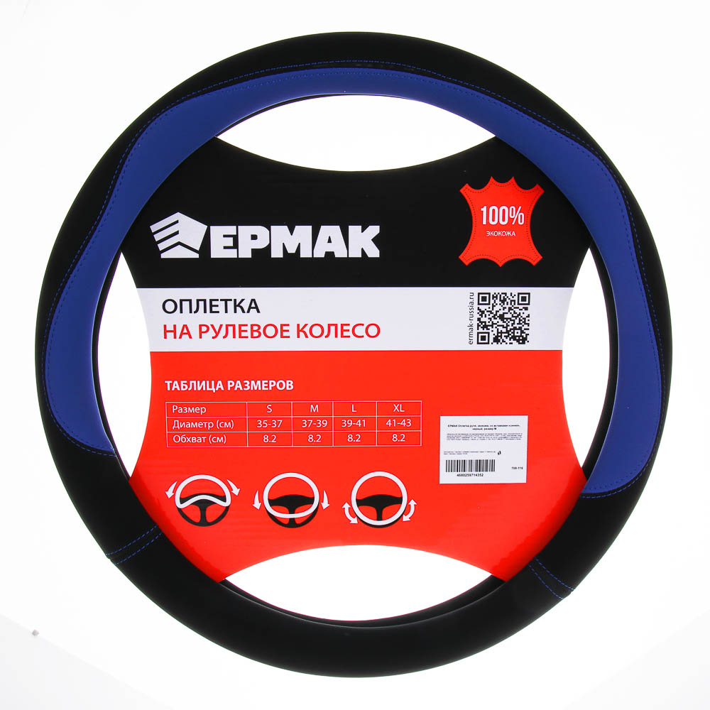 ЕРМАК Оплетка руля, экокожа, со вставками «синий», черный, размер М