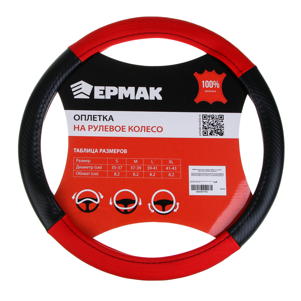 ЕРМАК Оплетка руля, экокожа, Карбон - А, черная с красными вставками, размер М