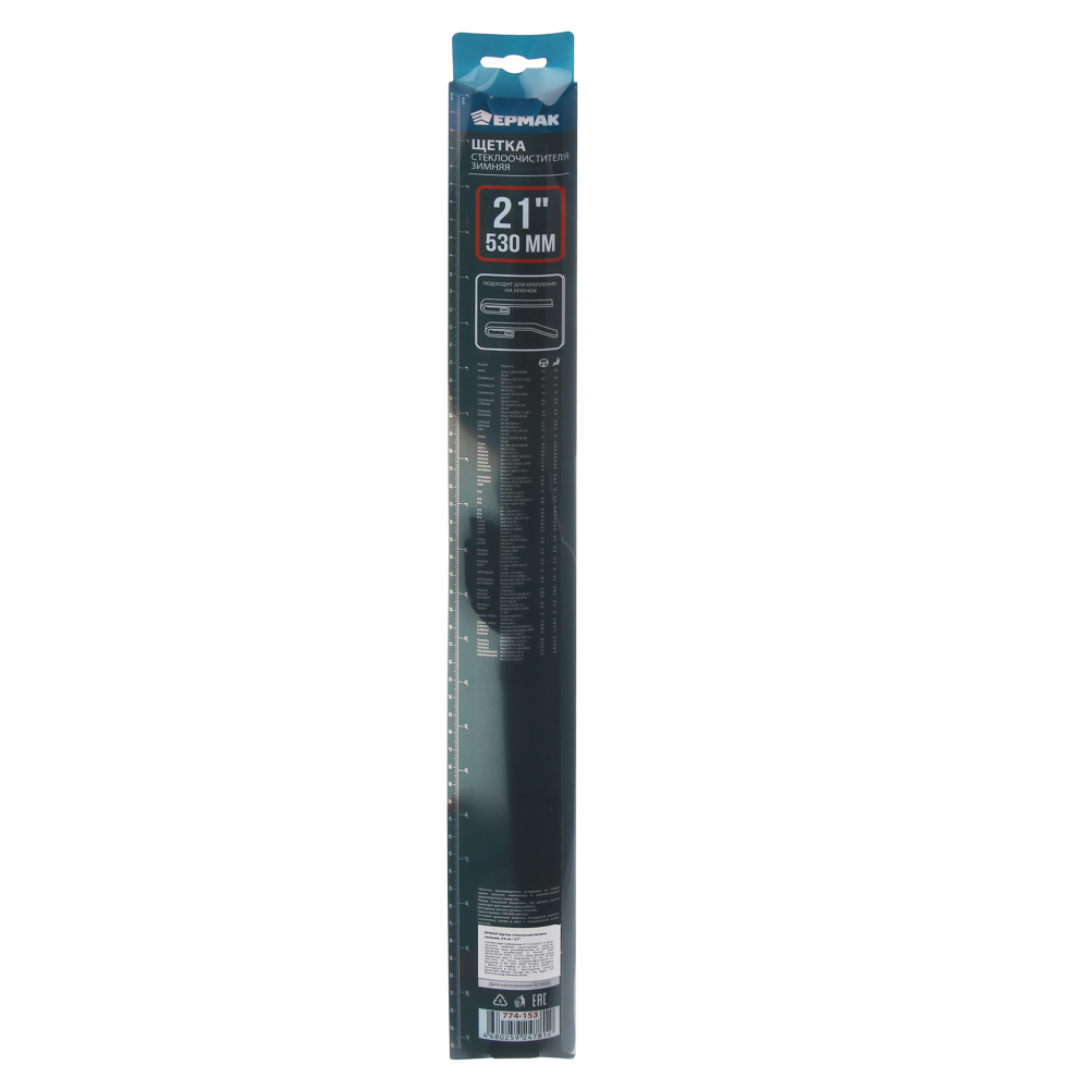 Щетка стеклоочистителя зимняя ЕРМАК, длиной 53 см/ 21", обеспечивает надежную работу в условиях снега и мороза. В основе конструкции лежит усиленный каркас, «упакованный» в резиновый чехол. Этот чехол предотвращает образование льда и наледи на элементах каркаса, тем самых сохраняя оптимальную прижимную силу и подвижность. Чистящий элемент зимних щеток значительно отличается от других типов стеклоочистителей, как формой профиля, так и составом. Чистящий элемент сохраняет эластичность даже в экстремальные морозы, что обеспечивает правильное скольжение по стеклу.