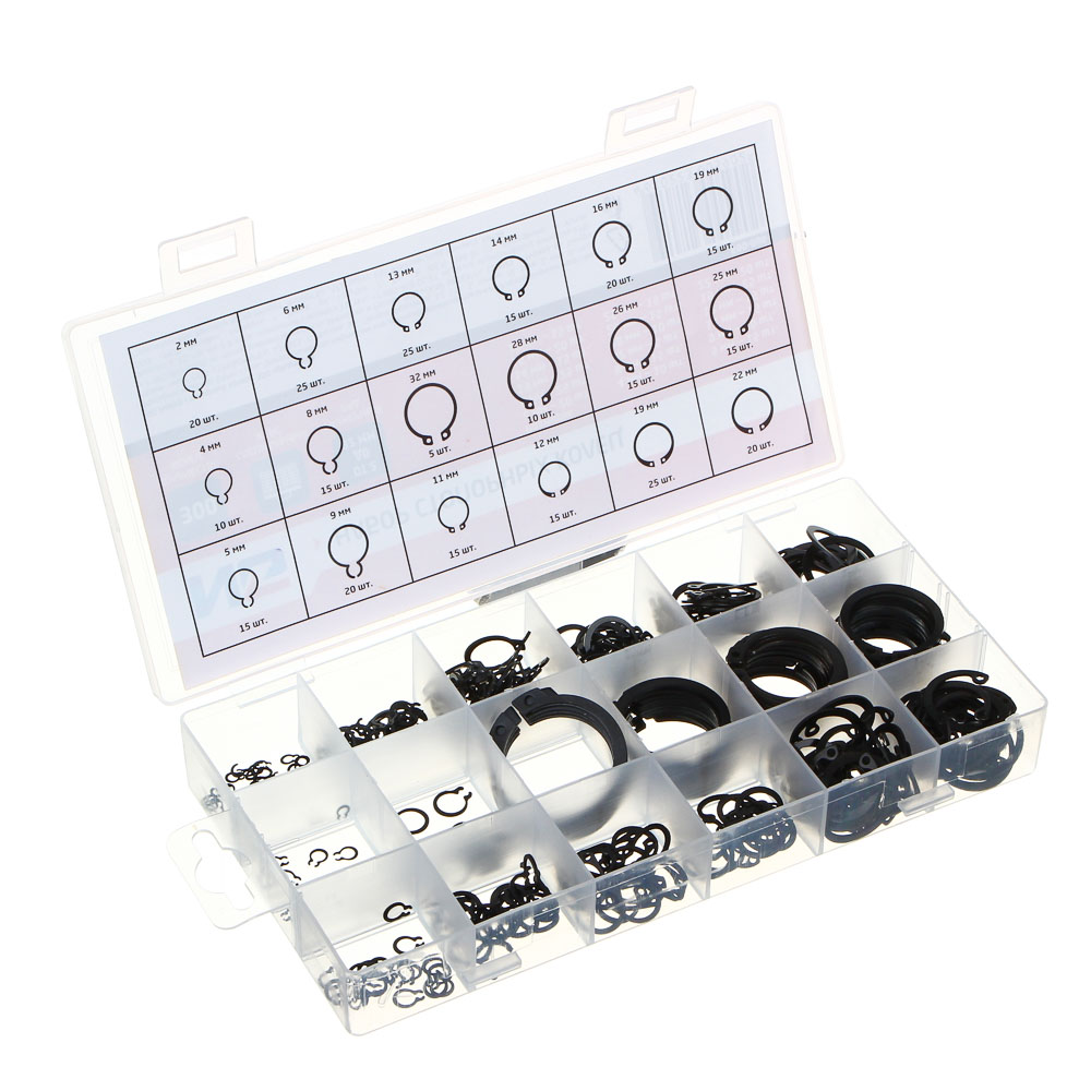 Набор стопорных колец 300 предметов в размерах 2 - 32 мм имеет в своем комплекте изделия, которые служат для предотвращения смещения деталей относительно друг друга. Стопорные кольца выполнены из прочной стали. Кейс из пластика служит для хранения и компактной транспортировки.