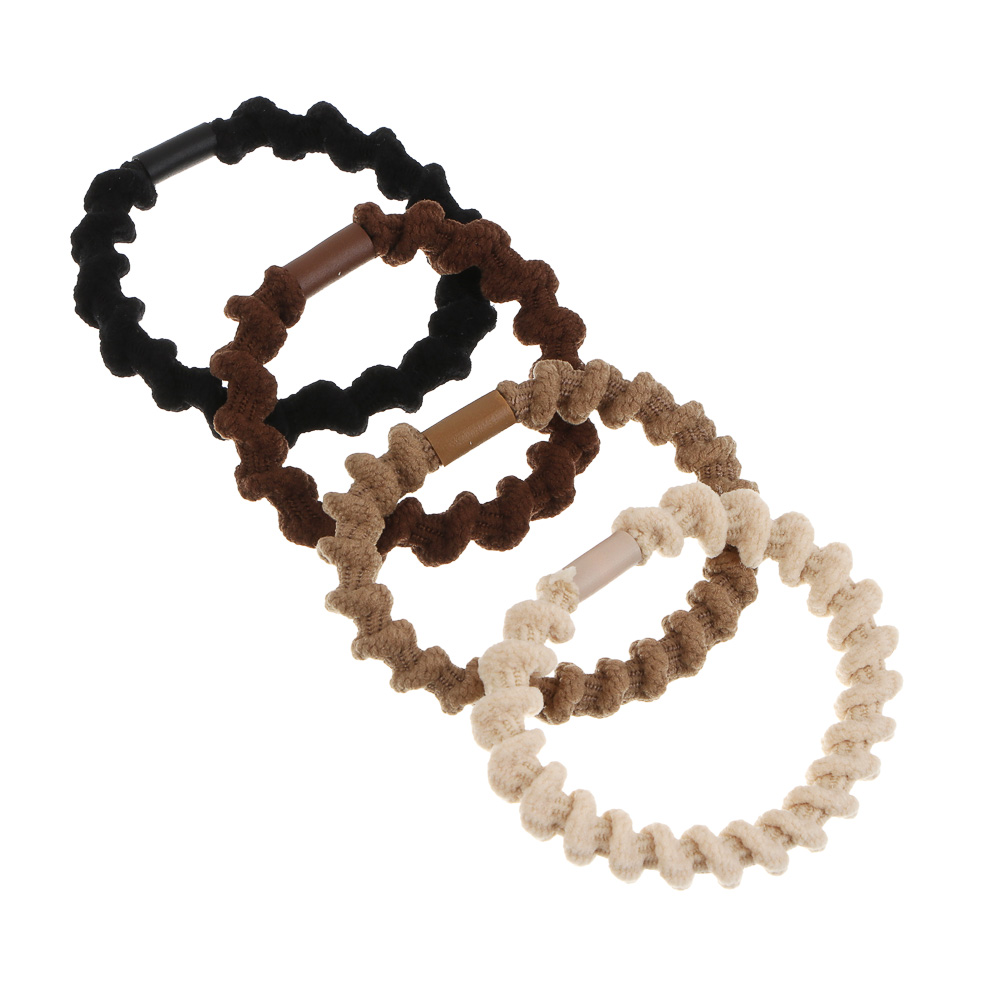 Набор из четырех эластичных резинок для волос станет незаменимым аксессуаром в вашей косметичке. Каждая резинка имеет оптимальный диаметр 5,5 см, что позволяет легко создавать различные прически — от простых хвостиков до сложных кос. Изготовленные из высококачественного полиэстера, резинки не травмируют волосы и не оставляют заломов. Благодаря своей мягкости и эластичности они надежно удерживают прическу в течение всего дня, при этом не стягивая волосы слишком сильно. Компактный набор резинок идеально подойдет как для повседневного использования, так и для создания праздничных причесок. Они не теряют форму после стирки и сохраняют свои свойства даже при длительном использовании.