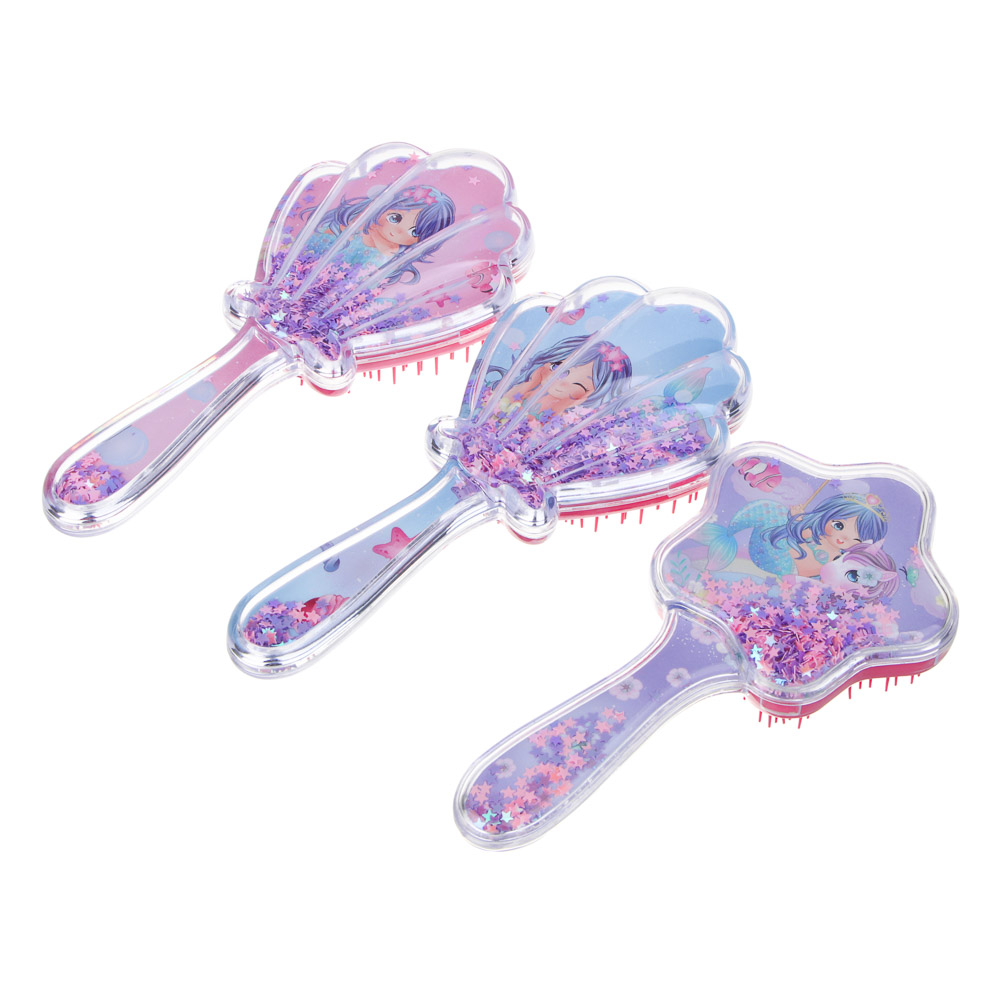 Детская массажная расческа ЮНИLOOK 19х9 см/17х9 см из пластика – это яркий привлекательный аксессуар для расчесывания волос. Пластиковая щетина отлично справляется с запутавшимися прядями, бережно расчесывает и оказывает массажный эффект на кожу головы без травматизации. Стильный дизайн в виде раковины или морской звезды с изображением русалки и блестками непременно понравится девочке, поэтому ребенок будет с удовольствием ухаживать за своими волосами и делать себе модные прически. 3 дизайна в ассортименте.
