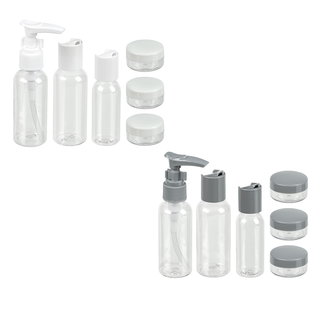 Баночки для крема 3 шт. (по 10 грамм), Бутылочки 2 шт. (по 50 мл), Бутылочка 1 шт. (30 мл) |
