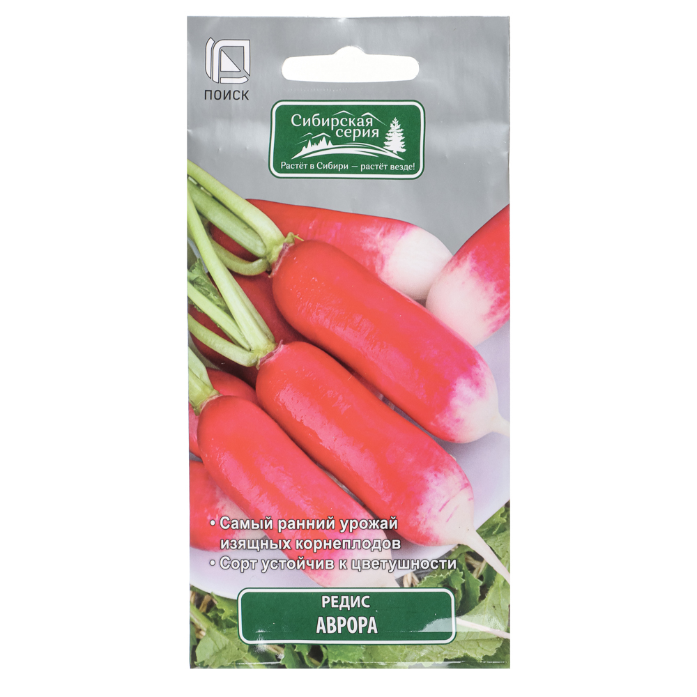 Семена редиса сорта «Аврора» предназначены для выращивания раннеспелого сорта с корнеплодами «один в один». Период от всходов до сбора корнеплодов составляет 17-20 дней. Корнеплоды ровные, цилиндрические, верхняя часть ярко-розовая, массой 16–18 г. Мякоть белая, плотная, приятного слабоострого вкуса. Сорт устойчив к цветушности, пригоден для одноразового сбора. Сроки посева — с 25 апреля по 20 мая и с 1 по 30 августа, глубина заделки семян — 1,5-2 см. Сбор урожая — с 25 мая по 1 июля и с 1 по 20 сентября. Схема посадки — 3х15-20 см. Сроки указаны для средней полосы России. Вес семян в упаковке — 3 г (±9%).