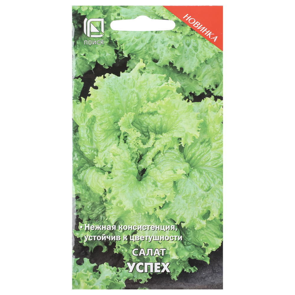 Семена салата сорта «Успех» предназначены для выращивания листового среднеспелого сорта в открытом грунте. Период от полных всходов до уборки урожая составляет 40-45 дней. Лист округлый, светло-зелёный, пузырчатый, край сильноволнистый, зубчатый. Масса растения — 450-470 г. Консистенция листьев нежная, вкус отличный. Ценность сорта: нейтрален к длине дня, устойчив к цветушности и болезням. Сроки посева — с 1 мая по 10 мая, глубина заделки семян — 0,5-1 см. Сбор урожая — с 20 июня по 30 июня. Схема посадки — 10-15х30-35 см. Сроки указаны для средней полосы России. Вес семян в упаковке — 1 г (±9%).