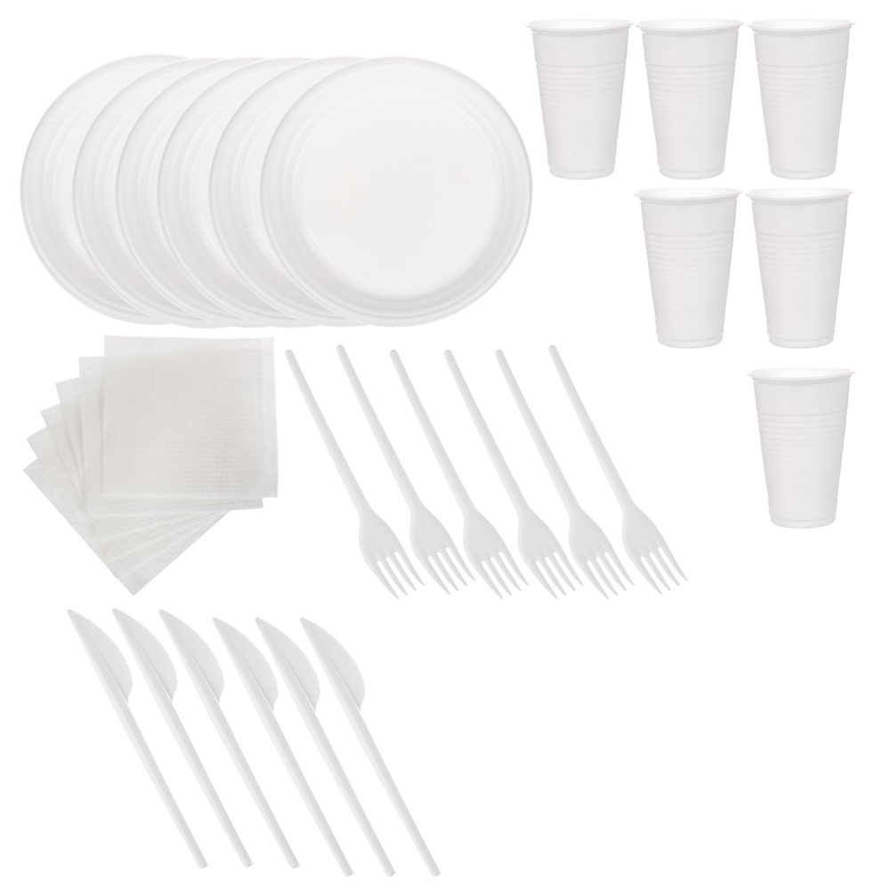 VIP Набор на 6 персон (окрашенный) – это стильный и практичный комплект посуды и аксессуаров, созданный для комфортного и эстетичного сервирования стола. Набор идеально подходит для праздничных мероприятий, пикников, вечеринок или повседневного использования. В комплект входят все необходимые элементы для сервировки на 6 персон, выполненные в едином дизайне. В набор входят тарелки диаметром 205 мм (6 штук), стаканы объемом 200 мл (6 штук), вилки (6 штук), ножи (6 штук) и бумажные салфетки. Все элементы изготовлены из высококачественного полипропилена, который отличается легкостью, прочностью и экологичностью. Набор выполнен в классическом белом цвете, который подчеркивает элегантность и универсальность, легко сочетаясь с любым декором и стилем сервировки.