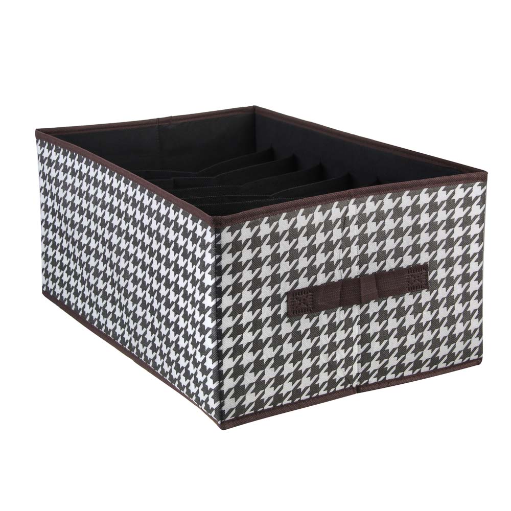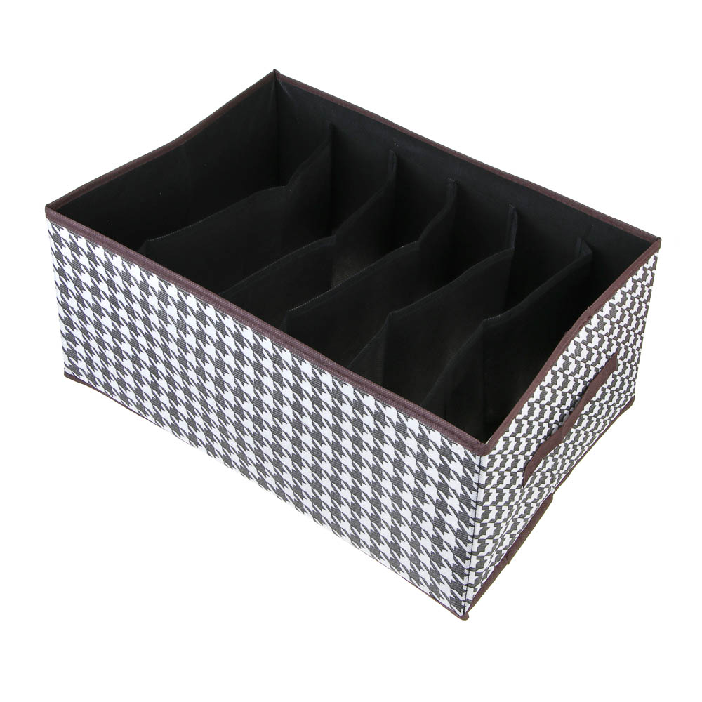 VETTA Органайзер для хранения — это универсальный помощник в организации пространства и поддержании порядка в вашем доме. Благодаря своим размерам 44х30х20 см и шести отделениям, он идеально подходит для хранения различных предметов, таких как одежда, обувь, аксессуары и многое другое. Изготовленный из полипропилена и картона, этот органайзер обладает высокой прочностью и долговечностью, обеспечивая надёжное хранение ваших вещей. Чёрно-белый дизайн с рисунком «гусиная лапка» придаёт изделию стильный и современный вид, который легко впишется в любой интерьер.