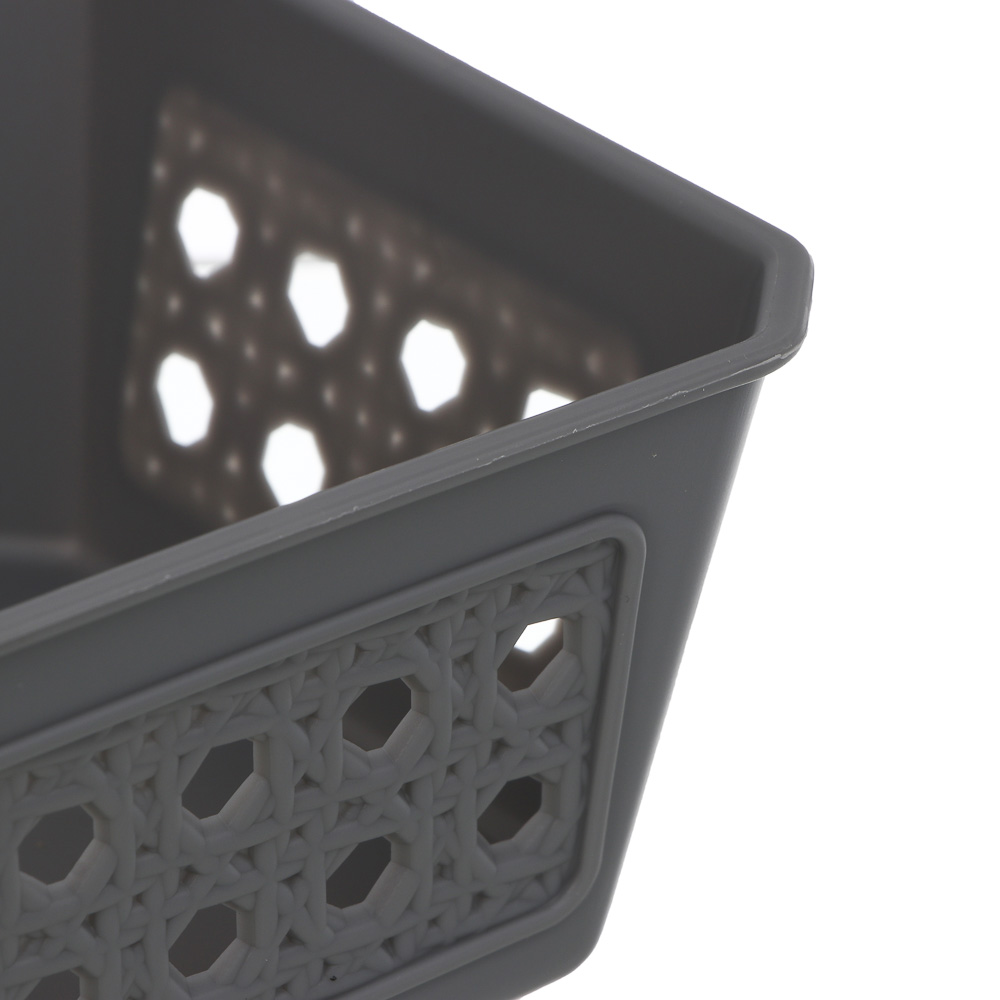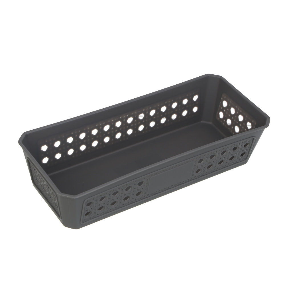 Стильная корзина VETTA – практичное решение для организации пространства в любом помещении! Благодаря компактным размерам 26,5х11,4х6,5 см она идеально подходит для хранения различных мелочей, не занимая много места. Современный дизайн в сером цвете гармонично впишется в любой интерьер, а перфорированные отверстия обеспечат отличную вентиляцию содержимого. Пластиковый материал гарантирует долговечность и лёгкость в уходе. Прочная конструкция корзины позволяет надёжно удерживать вещи, а специальная форма обеспечивает устойчивость при наполнении.
