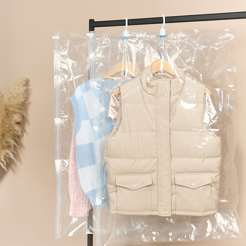 Подушки, одеяла, зимняя одежда, мягкие игрушки занимают много пространства в Вашем шкафу? Вакуумные пакеты с клапаном 70х100 см на 70% уменьшают пространство за счет откачки воздуха. Просто поместите вещи в пакет, закройте его с помощью застежки, присоедините шланг пылесоса к клапану и откачайте воздух. А крючок в комплекте позволит удобно разместить пакеты с вещами на штанге.