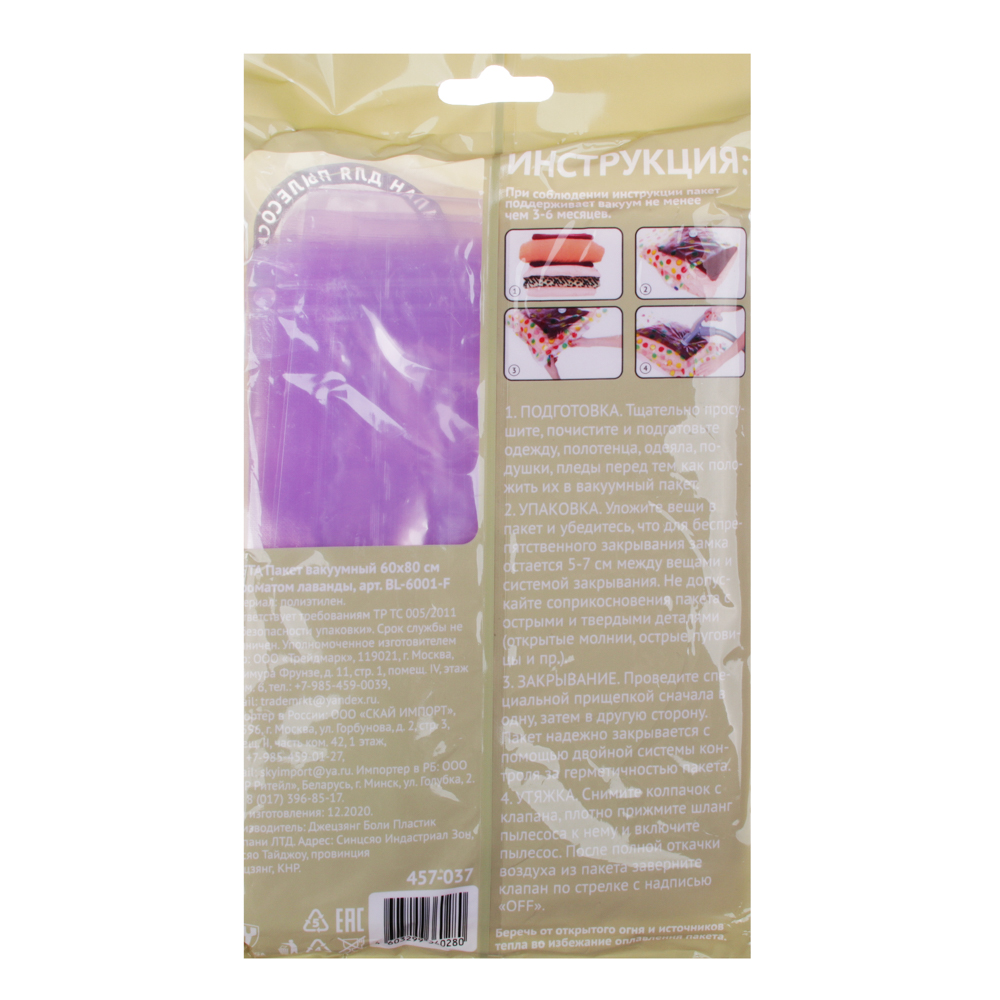 Вакуумный пакет VETTA размером 60х80 см с ароматом лаванды – идеальное решение для компактного и аккуратного хранения вещей. Благодаря прочному материалу и герметичному клапану для подключения пылесоса пакет надежно защищает содержимое от влаги, пыли, запахов и насекомых. При откачке воздуха объём уменьшается до 70%, что позволяет существенно сэкономить место в шкафу, чемодане или кладовой. Аромат лаванды придаёт вещам свежесть и лёгкий приятный запах. Подходит для хранения одежды, постельного белья, пледов и других текстильных изделий. Незаменимый помощник в доме и при подготовке к поездкам.