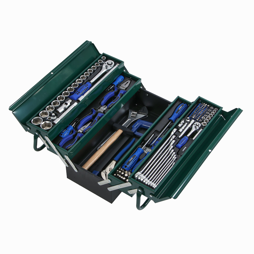 Торцевые головки 1/4": 4, 4.5, 5, 5.5, 6, 7, 8, 9, 10, 11, 12, 13 мм – 12 шт., Шарнир карданный 1/4" – 1 шт., Удлинители для торцевых головок 1/4": 50, 100 мм – 2 шт., Вороток-отвертка 1/4", 150 мм – 1 шт., Адаптер для бит SQ 1/4" – HEX 1/4" – 1 шт., Адаптер HEX 1/4" – SQ 1/4" – 1 шт., Адаптер быстрой замены бит – 1 шт., Биты, 30 мм: PH1, PH2, PH2, PH3, PH3, PH4, PZ3, PZ4, PZ5, PZ5, PZ6, PZ7, PZ8, SL3, SL4, SL5, SL5, SL6, SL7, SL8, T10, T10, T15, T15, T15, T20, T20, T25, T25, T25 – 39 шт., Трещотка для торцевых головок с быстрым сбросом, 72 зуба, 1/2", 1/4" – 2 шт., Ключи комбинированные: 8, 10, 11, 12, 13, 14, 17, 19, 22 мм – 9 шт., Торцевые головки SUPER-LOCK 1/2": 10, 11, 12, 13, 14, 15, 16, 17, 18, 19, 20, 21, 22, 23, 24, 27, 30, 32 мм – 18 шт., Удлинители для торцевых головок 1/2": 125, 250 мм – 2 шт.;<br /> Шарнир карданный 1/2" – 1 шт., Адаптер трехпозиционный 3/8"F – 1/2"M – 1 шт., Клещи переставные, 250 мм – 1 шт., Бокорезы ,160 мм – 1 шт., Плоскогубцы, 180 мм – 1 шт. |