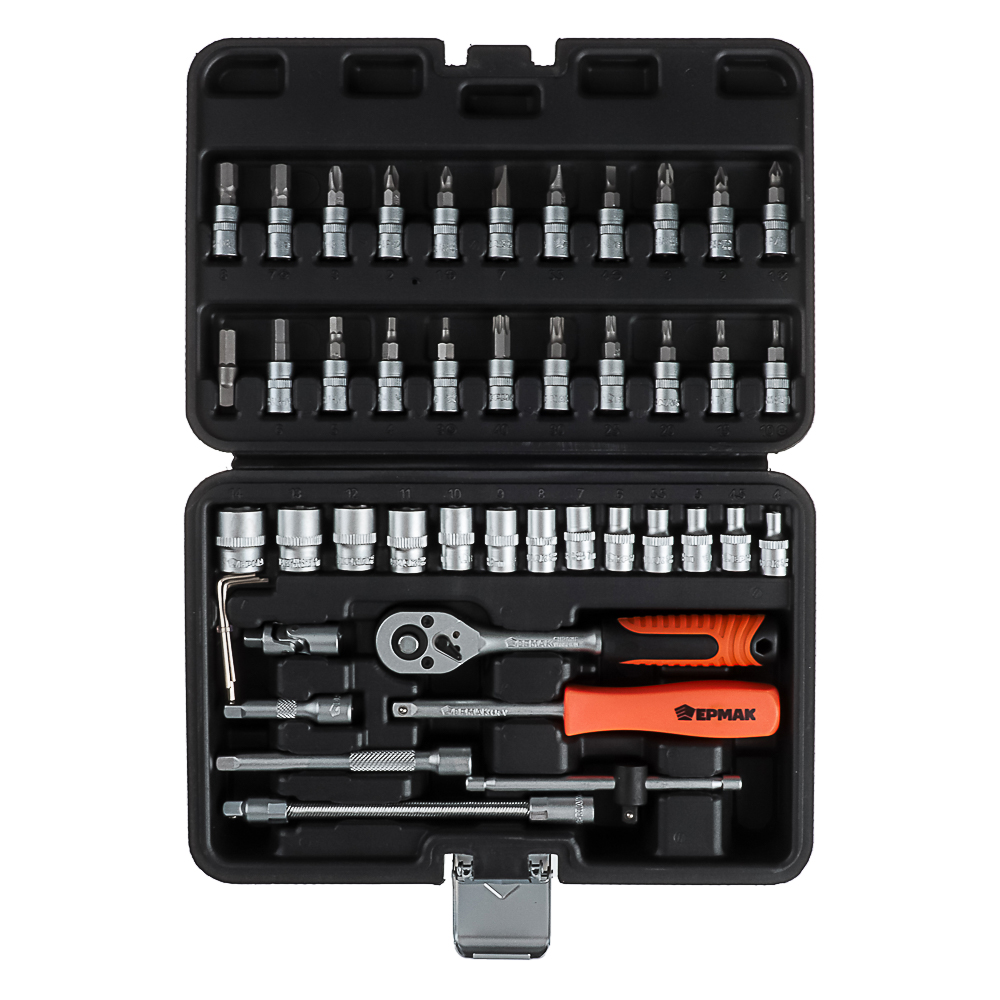 Торцевые головки 6-гранные 1/4" (13 шт.): 4-4.5-5-5.5-6-7-8-9-10-11-12-13-14 мм, Биты 1/4" (21 шт.): Т10-Т15-Т20-Т25-Т30-Т40, РН1-РН2-РН3, РZ1-РZ2-РZ3, H3-H4-H5-H6-H7-H8, SL4-SL5.5-SL7, Ключи шестигранные (4 шт.): 1.27, 1.5, 2, 2.5 мм |