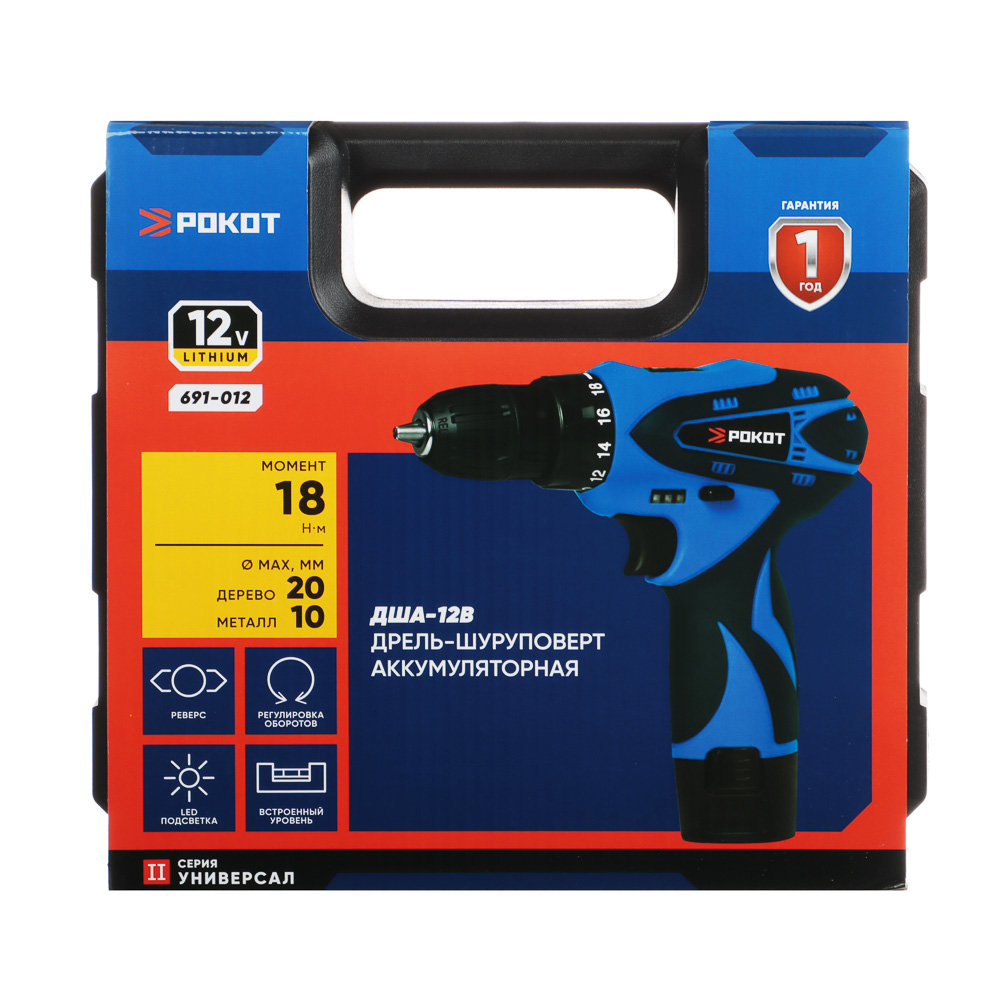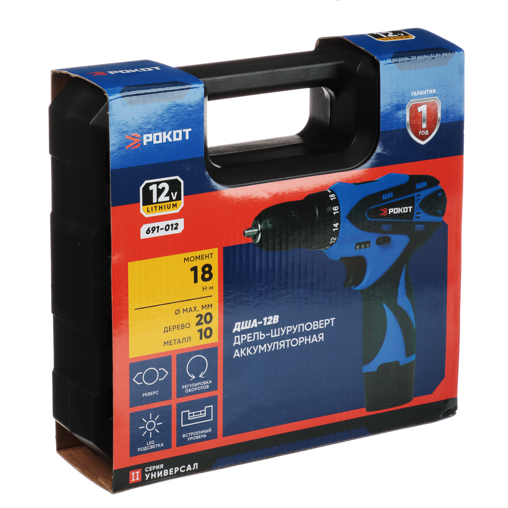 РОКОТ Дрель-шуруповерт аккум. ДША-12в, 0-550 об/мин, 1,3 Li-on (1), 18 н*м, подсветка