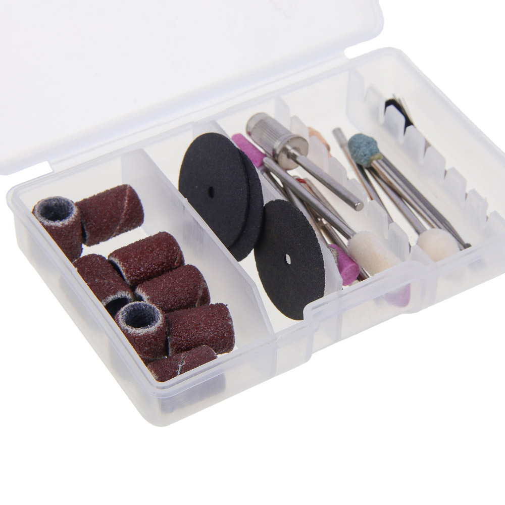 Маленькие шлифовальные круги 8 шт., Отрезные диски 3 шт., Шлифовальные головки (силикон-карбидные, 2,3 мм) 6 шт., Алмазные шлифовальные иглы (2,3 мм) 3 шт., Сферические фрезы из быстрорежущей стали (2,3 мм) 2 шт., Нейлоновая щетка (2,3 мм) 1 шт., Цанга (3,2 мм) 1 шт., Оправка для отрезного круга (2,3 мм) 1 шт., Шатун металлический (2,3 мм) 1 шт., Войлочные круги (2,3 мм) 2 шт. |