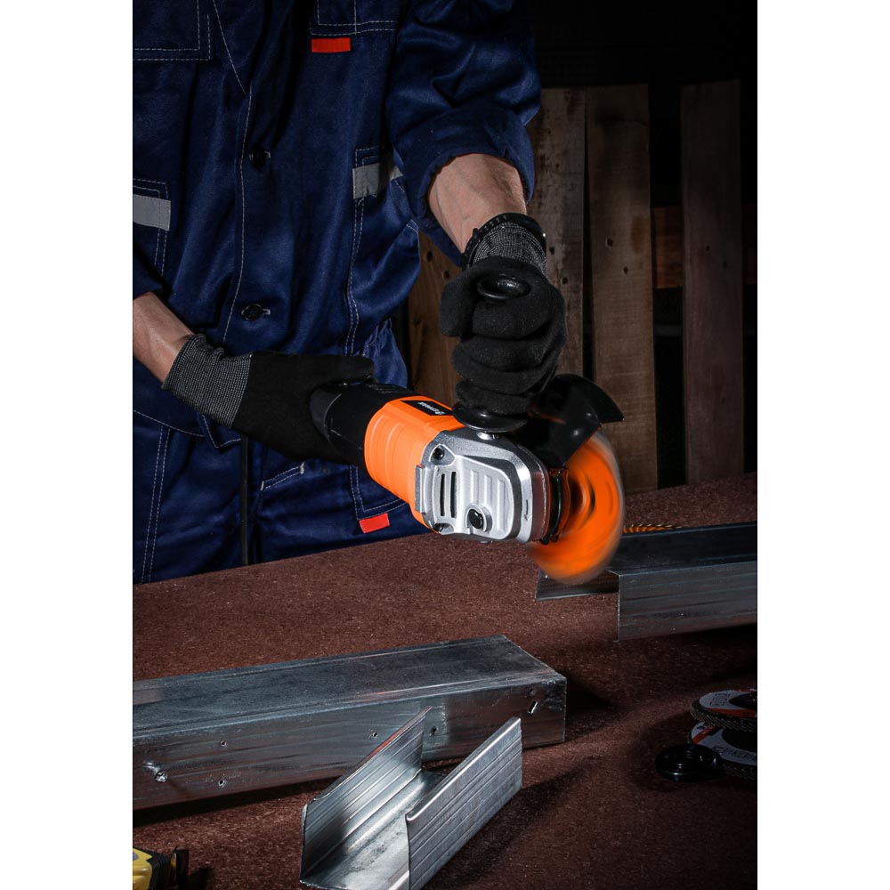 Угловая шлифовальная машина ЕРМАК УШМ-150/1200 — мощный и надежный инструмент для резки, шлифования и зачистки различных материалов. Модель идеально подходит для работы с металлом, камнем и другими конструкционными материалами как в бытовых условиях, так и на профессиональной площадке. Компактная конструкция и эргономичная дополнительная рукоятка обеспечивают удобный и безопасный захват, а регулируемый защитный кожух защищает пользователя от искр и частиц материала. Мощный двигатель на 1200 Вт позволяет эффективно справляться с металлами и плотными материалами, а высокая скорость вращения диска — до 10 500 об/мин — обеспечивает чистую и быструю обработку поверхностей.