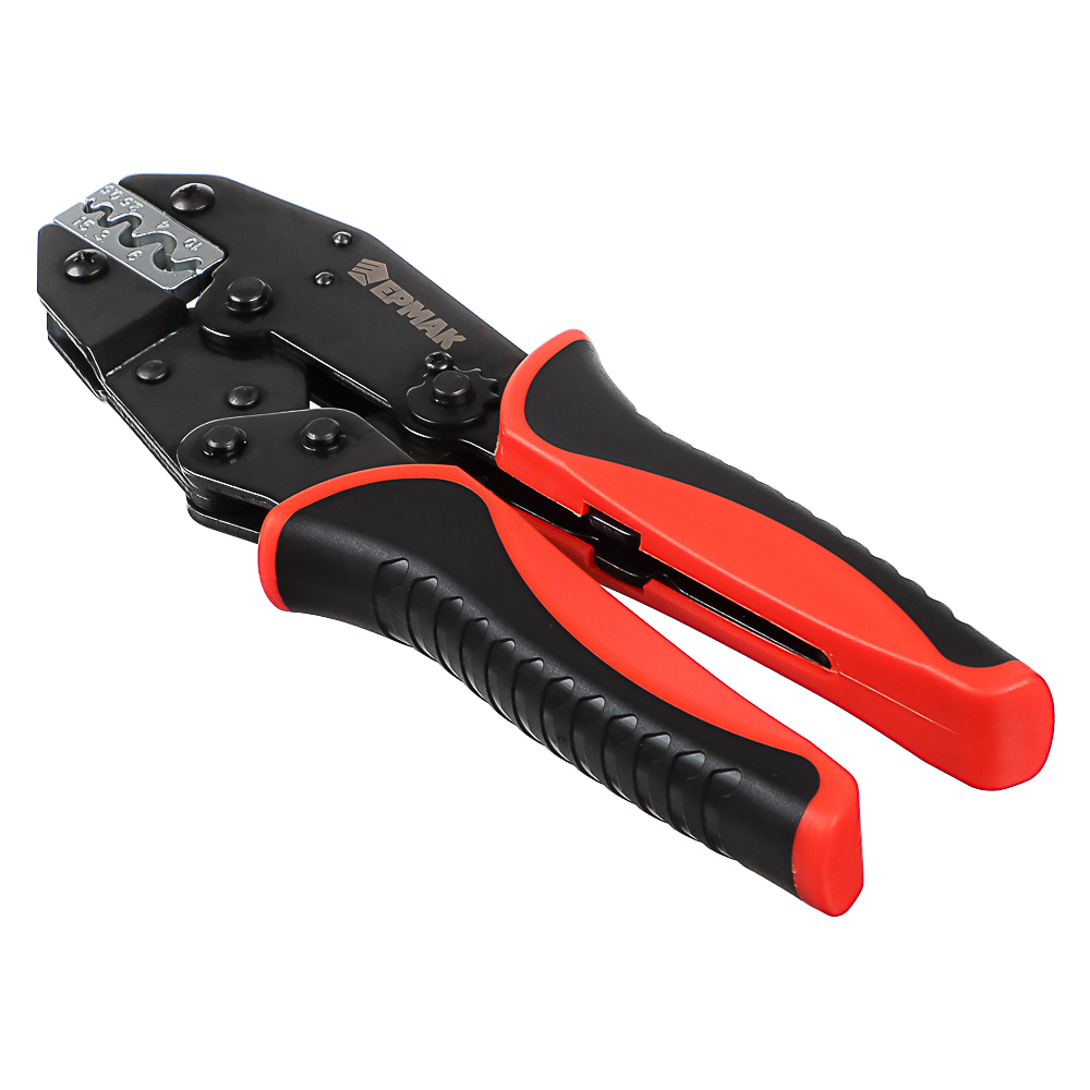 Обжимные пресс-клещи ЕРМАК предназначены для профессионального использования для обжима кабельных неизолированных наконечников и гильз. Тип обжима – клиновидный. Рычажная конструкция обеспечивает удобство в процессе обжима одной рукой. Храповый механизм для полного цикла опрессования. Предусмотрен регулятор прижимного усилия матриц. Возвратная пружина увеличивает скорость работы. Двухкомпонентная рукоятка с антискользящими накладками обеспечивает комфортный хват. Диапазон сечения – 0,5-10 мм2. Сталь с антикоррозийным покрытием значительно продлевает срок службы инструмента.