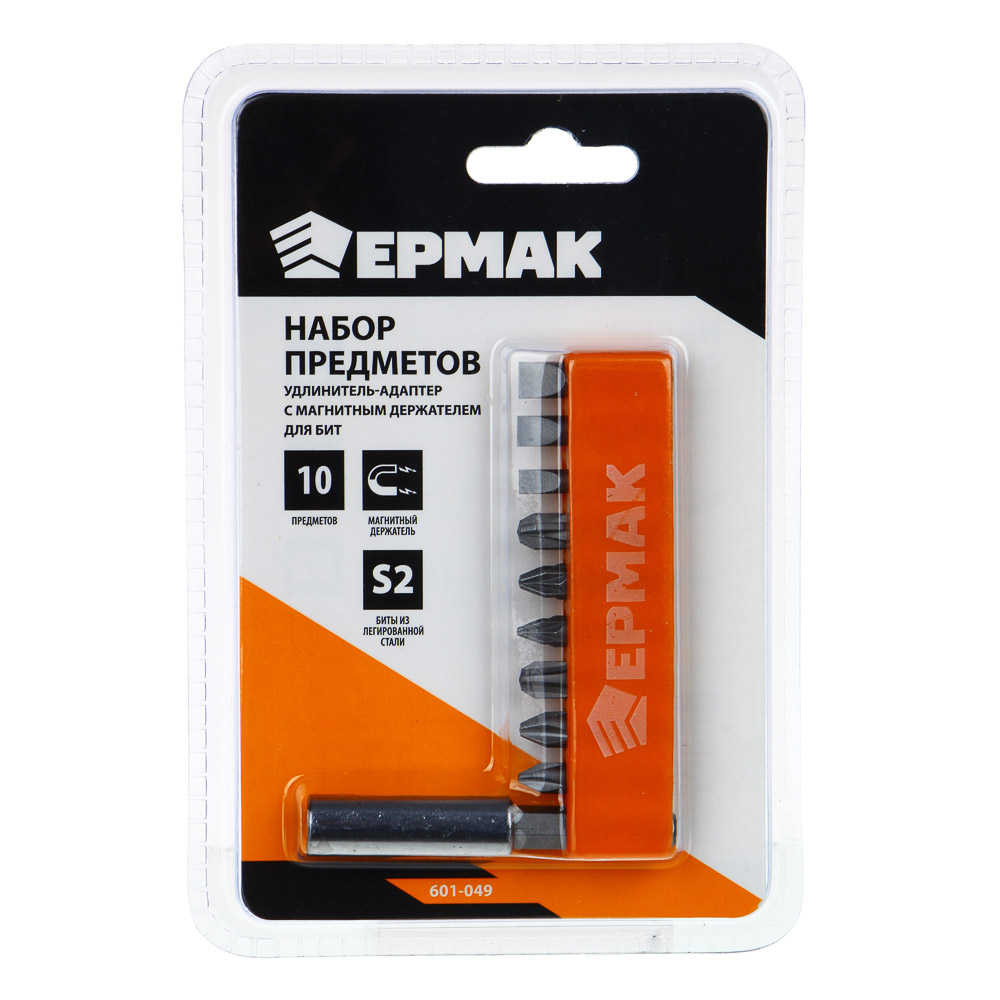 Набор из 10 предметов ЕРМАК включает 9 бит длиной 25 мм и удлинитель-адаптер с надежным магнитным шестигранным держателем для бит размером 60 мм для работы с винтами и шурупами. Биты из легированной стали S2 имеют высокую степень стойкости к коррозии, обладают отличной прочностью, устойчивы к деформации и механическим воздействиям. В комплекте предусмотрены самые популярные типы бит: PH1/2/3, SL4/5/6 и PZ1/2/3. Набор включает мини-подставку для хранения с маркировкой.