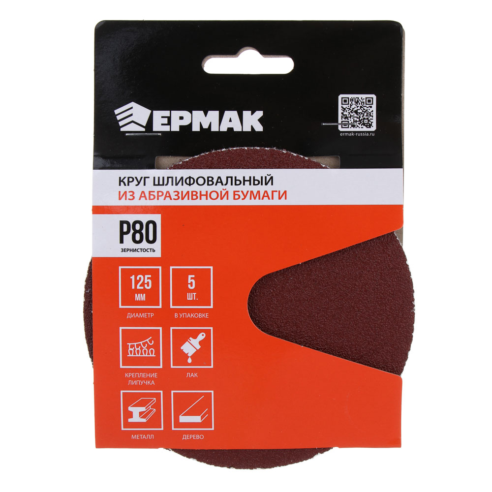 ЕРМАК Круг шлифовальный из абразивной бумаги на велкро основе, без отверстий, P80, 125 мм, 5шт.