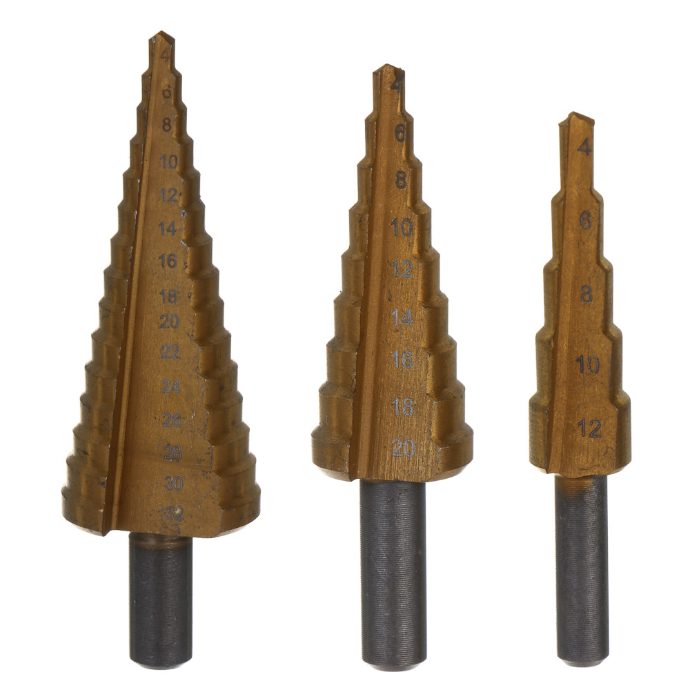 Набор ступенчатых сверл из трёх предметов предназначен для сверления отверстий в тонколистовых профилях, трубах, листовой стали, алюминии, титане, меди, латуни и других цветных металлах и сплавах, а также в прочных сталях и чугунах, пластиках и полимерах. Сверла имеют размеры: 4–12 мм, 4–20 мм и 4–32 мм. Они оснащены трёхгранным хвостовиком и изготовлены из быстрорежущей стали HSS с титановым покрытием для улучшения отвода тепла и сохранения режущих кромок.