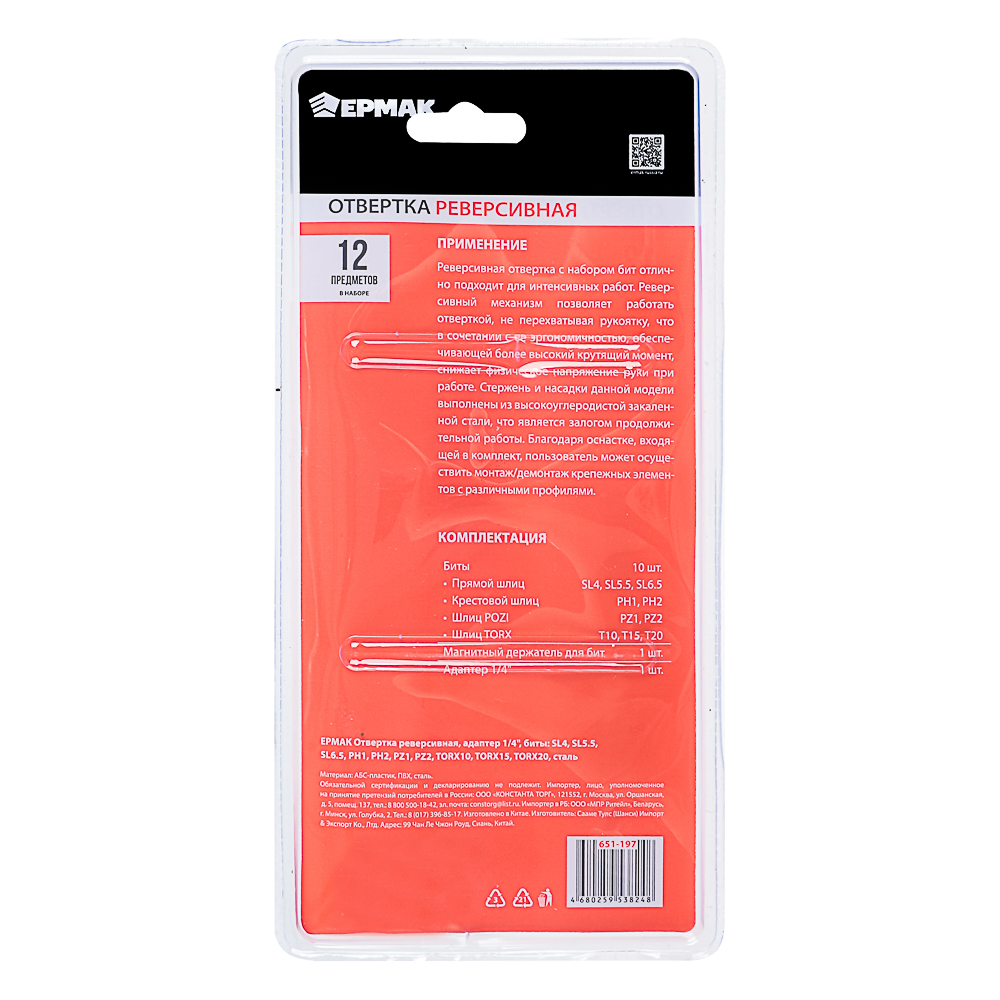 ЕРМАК Отвертка реверсив.,адаптер 1/4,биты:SL4,SL5.5,SL6.5,PH1,PH2,PZ1,PZ2,TORX10,TORX15,TORX20,сталь