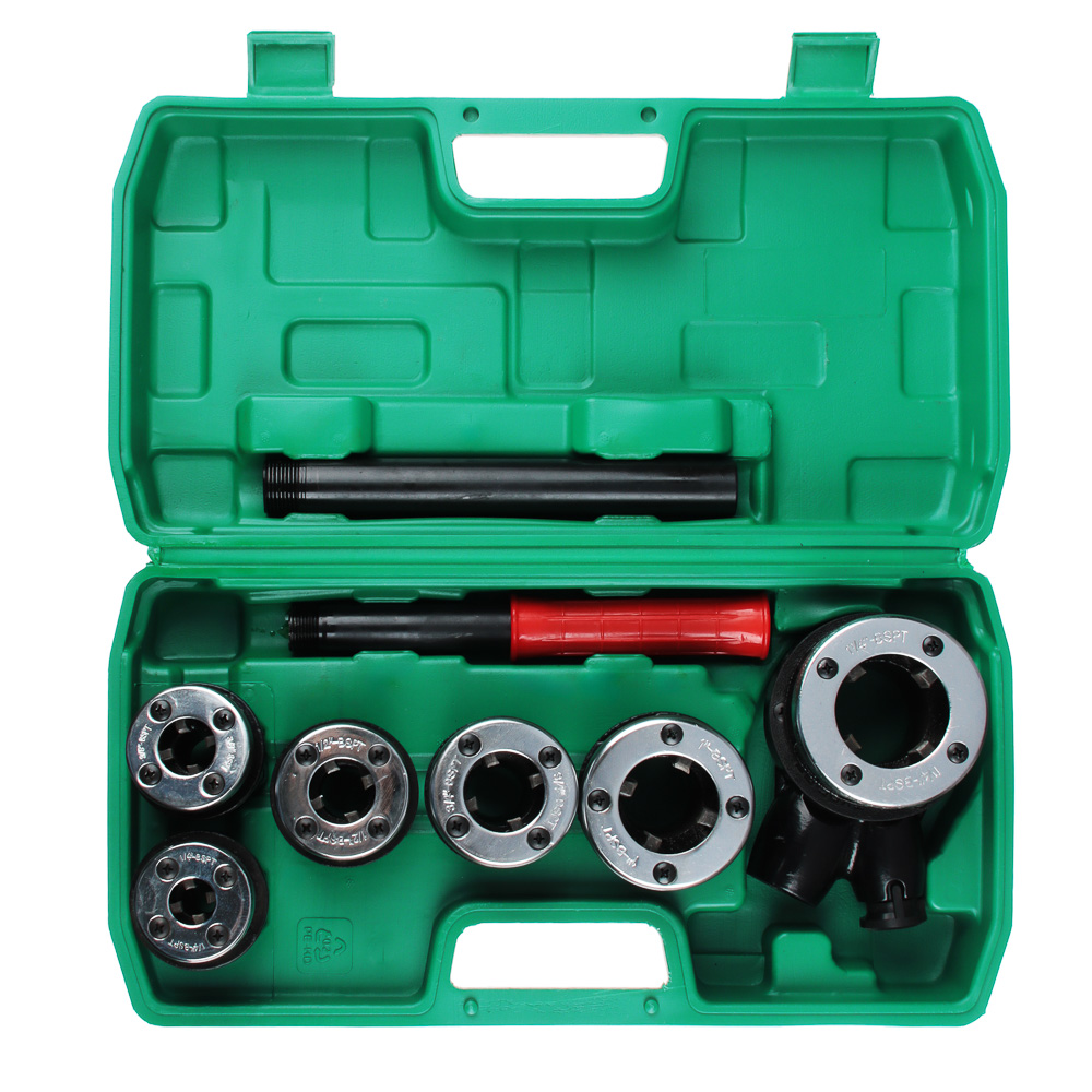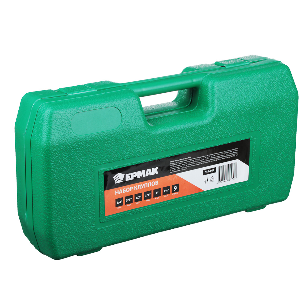 Набор клуппов ЕРМАК Набор клуппов КТ-9 предназначен для нарезания наружной резьбы на трубах при выполнении сантехнических и монтажных работ. В комплект входят клуппы размеров 1/4″, 3/8″, 1/2″, 3/4″, 1″ и 1 1/4″, что позволяет работать с широким диапазоном труб и соединений. Инструменты изготовлены из прочной инструментальной стали, обеспечивающей надёжность и длительный срок службы. Набор оснащён трещоткой с ручкой и удлинителем для увеличения рычага, что облегчает процесс работы и снижает прикладываемое усилие. Все элементы размещены в удобном пластиковом кейсе, который обеспечивает компактное хранение и удобную транспортировку. Отлично подходит как для профессионального использования, так и для бытовых задач.