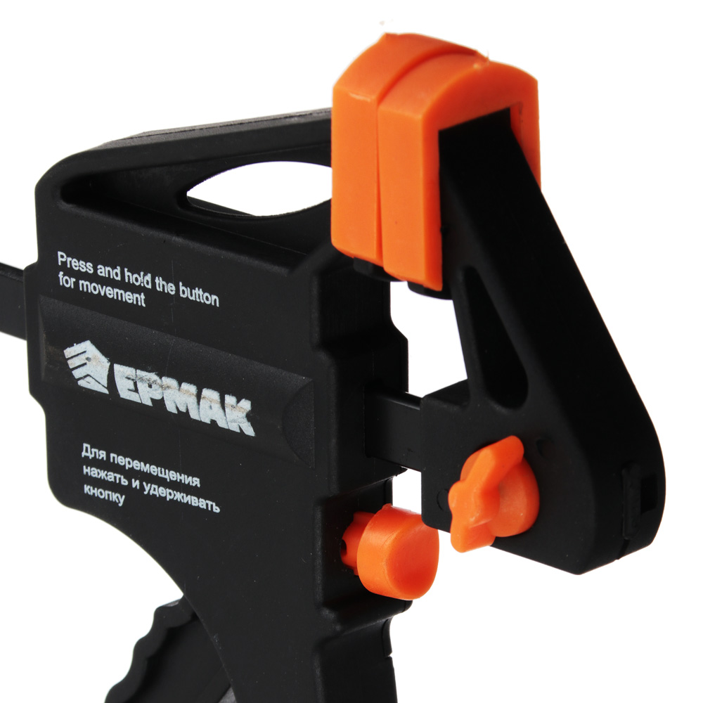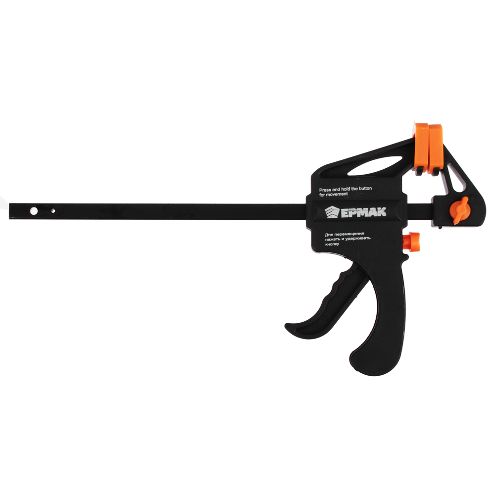 Универсальная F-образная быстрозажимная струбцина ЕРМАК, 150 х 265 х 45 мм, в пластиковом корпусе, используется в столярном деле. Позволяет быстро фиксировать заготовки с целью их соединения или обработки — склеивания, сверления, шлифовки, пиления и других видов работ. Подвижная губка перемещается вдоль штанги при помощи пластинчатого механизма, а фиксатор препятствует разжиманию струбцины. Компактный размер упрощает работу с инструментом. Преимущества: Направляющая изготовлена из стали и устойчива к нагрузкам, поэтому выдерживает значительные усилия при сжатии предметов. Рабочие элементы выполнены из ударопрочного пластика и обладают высокой механической стойкостью, что увеличивает срок службы инструмента. Защитные накладки на губках предохраняют зажимаемые детали от повреждений. Опорную губку можно установить на противоположный конец штанги, после чего использовать струбцину на разжим.