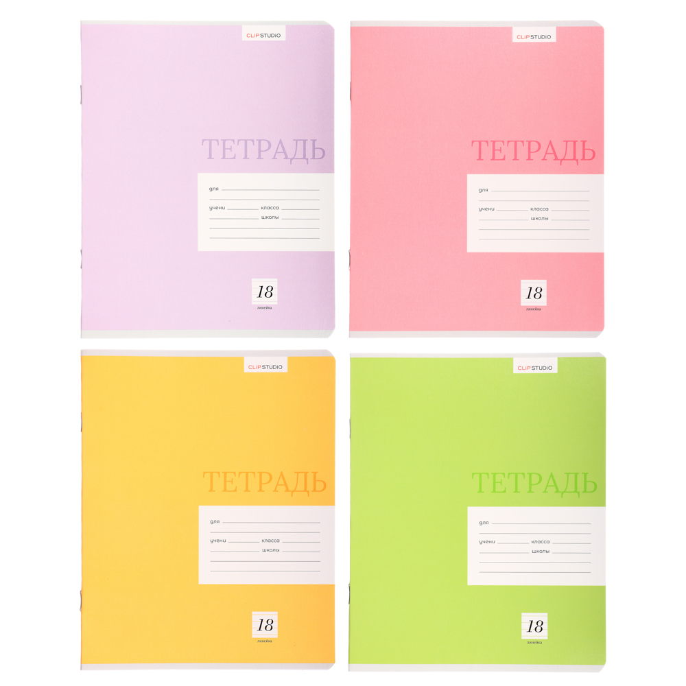 ClipStudio Тетрадь школьная 18л. в линейку, БЕЛЫЕ ЛИСТЫ, обл. плотный офсет, "Однотонная", скрепка