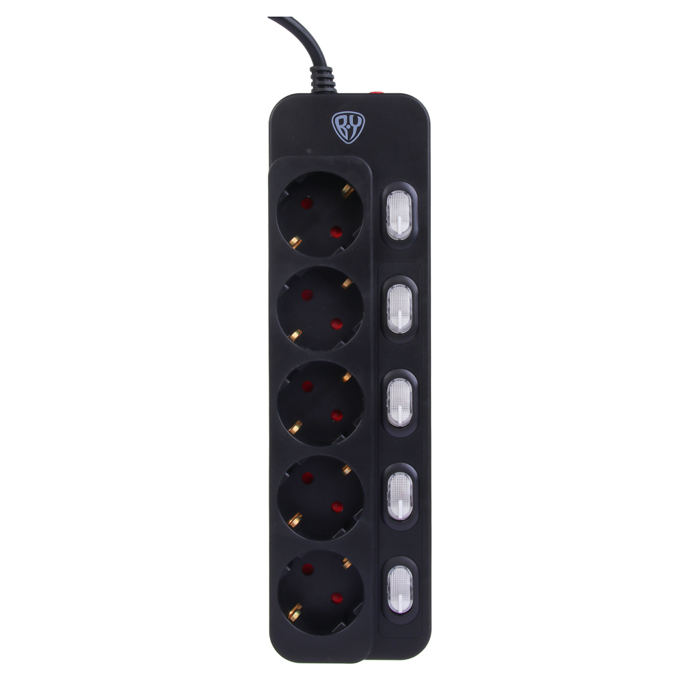 BY Удлинитель сетевой фильтр 5 розеток, 2м, 0,75кв.мм,10А, 2500Вт с отд. выключателями, чёрный