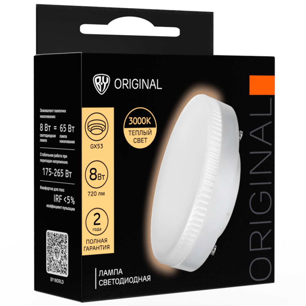 BY Лампа светодиодная GX53 8 Вт, 720 Лм, 3000 K, 175-265 В, Ra>80, IRF <5%,IC, 2 года гар.