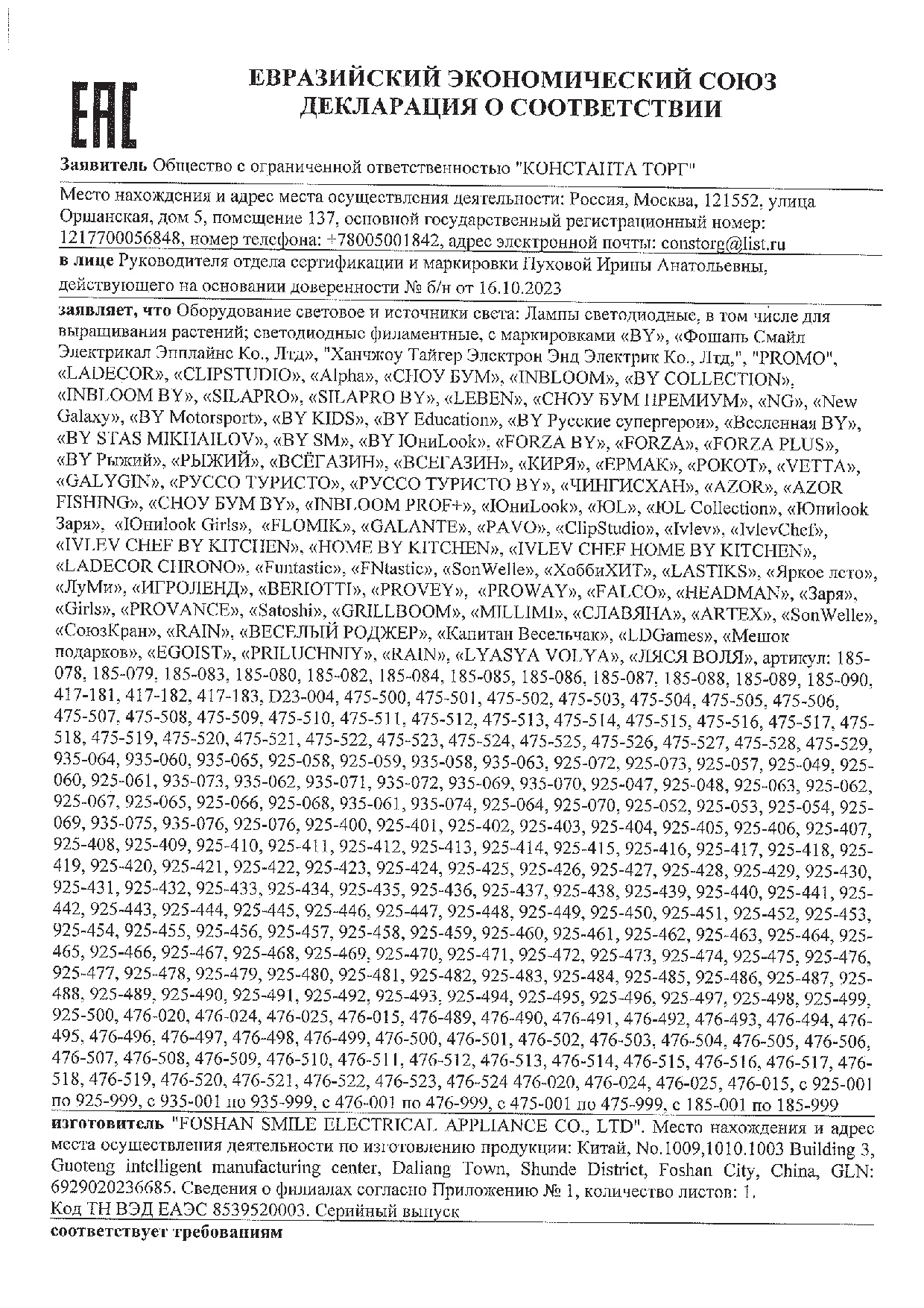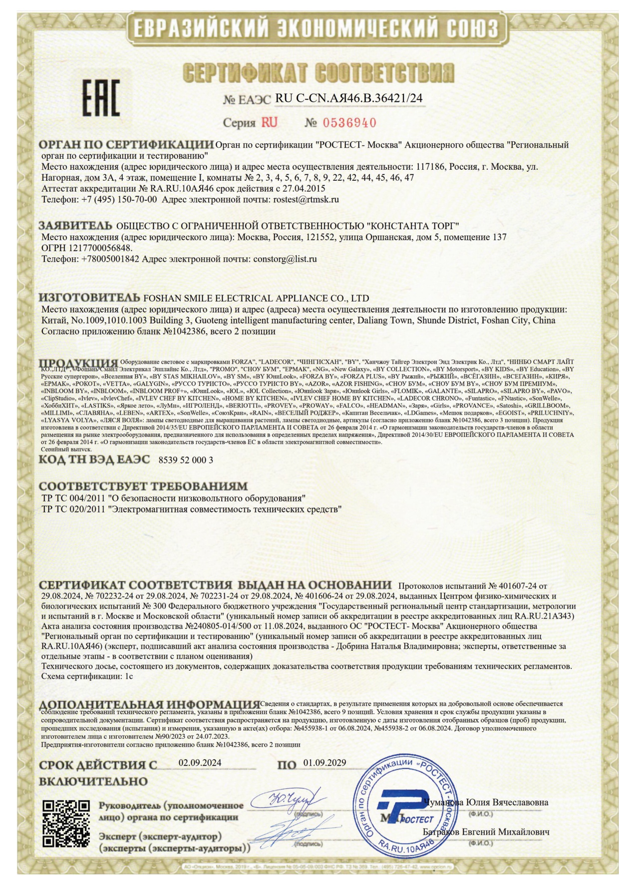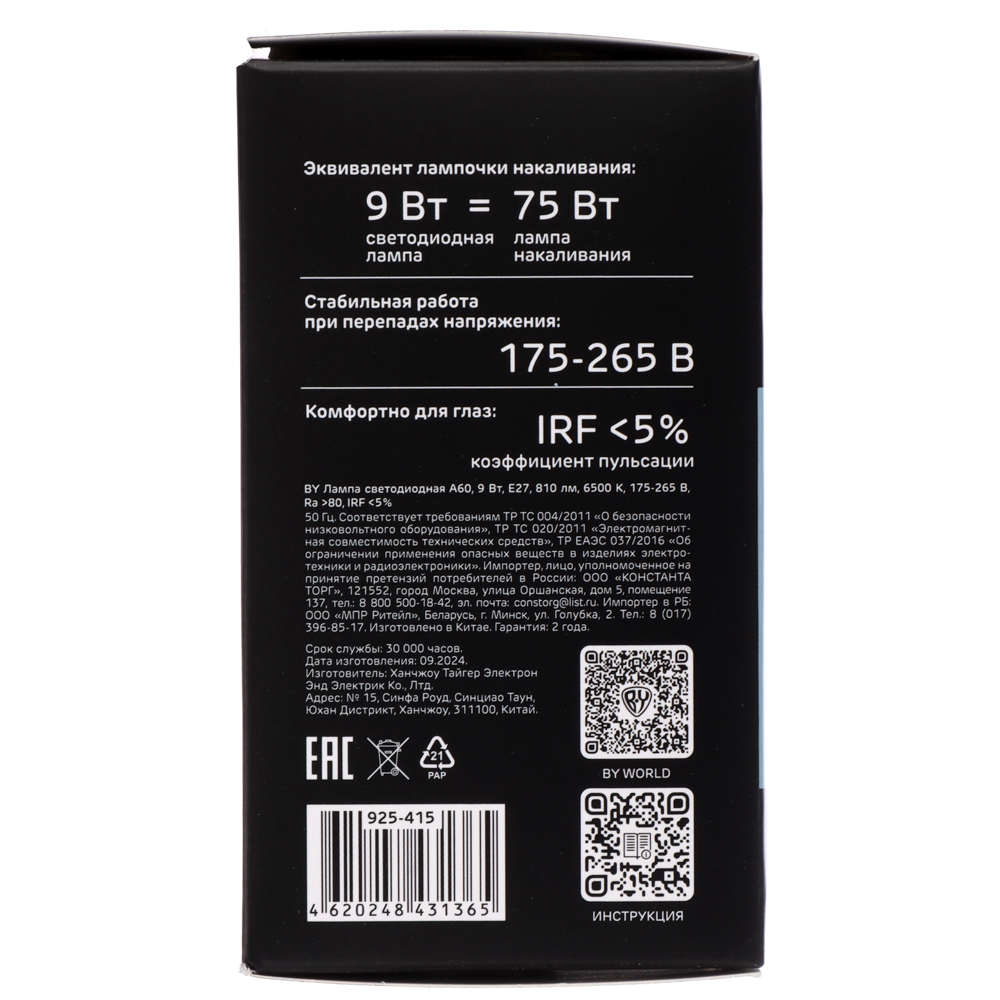 Светодиодная лампа BY A60 мощностью 9 Вт с цоколем E27 и световым потоком 810 Лм обеспечивает яркое и равномерное освещение. Цветовая температура 6500 K создаёт холодный белый свет, подходящий для рабочих зон и помещений с высокой освещённостью. Лампа работает в диапазоне напряжений 175–265 В, что делает её устойчивой к перепадам электричества. Индекс цветопередачи Ra>80 гарантирует естественные цвета освещаемых предметов, а коэффициент пульсации IRF <5% предотвращает усталость глаз.