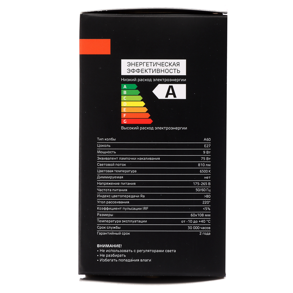 BY Лампа светодиодная A60 9 Вт, E27, 810 Лм, 6500 K, 175-265 В, Ra>80, IRF <5%,IC, 2 года гар.