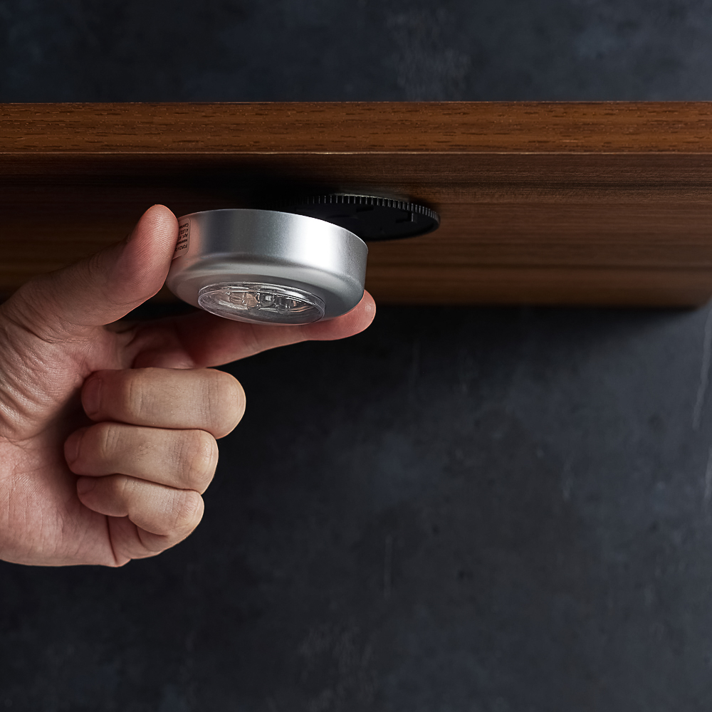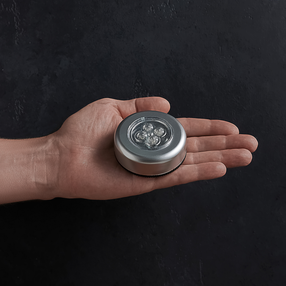 Точечный нажимной светильник — стильное решение для дома, офиса и ресторана. Нажмите на устройство, чтобы комната наполнилась приятным и ненавязчивым светом. Устройство оснащено пятью светодиодами и не требует подключения к электросети. Точечный нажимной светильник работает от трех ААА батареек.