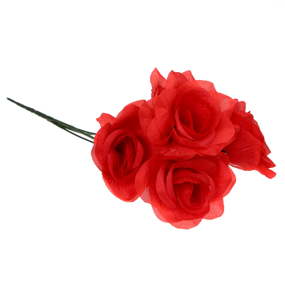 Букет искусственных цветов в виде красной розы длиной 34 см из ткани и пластика – это декоративная цветочная композиция, которая может стать элементом оформления интерьера и будет красиво смотреться в вазе, делая обстановку более яркой и уютной. Букет смотрится естественно, имеет привлекательный цвет и может использоваться как атрибут для предметной фотосьемки или фотосессии.
