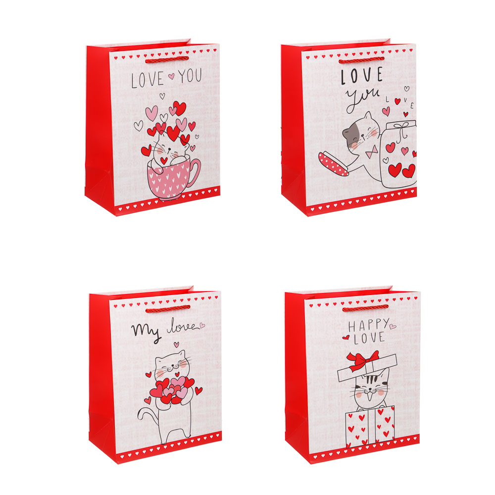 Пакет подарочный бумажный тм LADECOR, размер M 18x23x10 см, "Сердце" арт 2 – это очаровательная подарочная упаковка с милым принтом с изображением кота с сердечками, которая поможет передать чувства нежности, заботы и искренней привязанности, а также сделает момент вручения подарка по-настоящему трогательным и запоминающимся. Сочетание белого и красного создает яркий, праздничный и очень позитивный визуальный образ. Размер идеально подходит для упаковки небольшой мягкой игрушки, косметики, книг, сладостей, аксессуаров или парфюма. Плотная бумага и надежные ручки гарантируют сохранность подарка. 4 дизайна в ассортименте.
