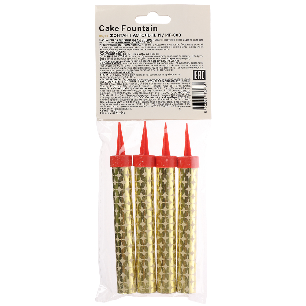 Праздничный фейерверк для торта от надёжного производителя ТМ «МАКСЭМ» превратит обычный момент задувания свечей в яркое и запоминающееся событие! Набор из четырёх свечей-фонтанов станет настоящим украшением любого торжества и подарит гостям незабываемые впечатления. Изысканный аксессуар высотой 10-12,5 сантиметров с удобной подставкой идеально подходит для любого торта. Золотые искры создают завораживающее световое шоу продолжительностью 30 секунд, наполняя праздник атмосферой волшебства и радости. Высокое качество исполнения гарантирует безопасное и надёжное использование свечей в помещении. Специальная конструкция обеспечивает стабильную работу и эффектное представление, которое никого не оставит равнодушным.