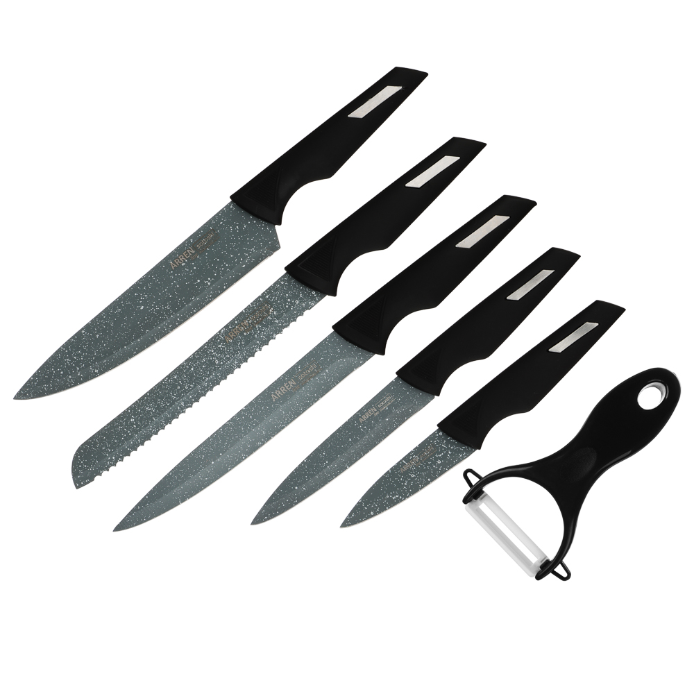 Поварской шеф-нож – 1 шт., Нож для нарезки – 1 шт., Нож для хлеба – 1 шт., Нож универсальный – 1 шт., Нож для фруктов и овощей – 1 шт., Овощечистка – 1 шт., Магнитная коробка - 1 шт. |