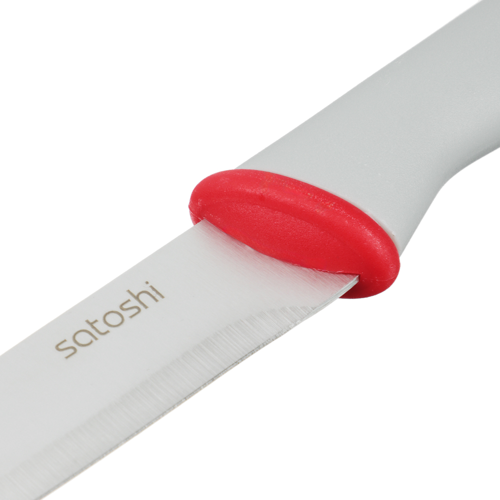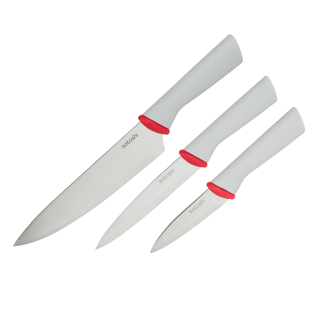Набор кухонных ножей SATOSHI «Премьер» включает 3 ножа. Комплект ножей поможет выполнять различные задачи на кухне по разделке, нарезке и шинковке продуктов. Нож-шеф с диной лезвия 20 см удобен для быстрой нарезки овощей, зелени и фруктов. Универсальный нож 12,7 см справится с чисткой овощей и разделкой мяса и рыбы. Маленький нож 9 см удобен для вскрытия упаковок, мелких нарезок и чистки продуктов от кожуры. Рукоятки из полипропилена приятно ложатся в руку и не выскальзывают. Набор ножей «Премьер» – прекрасный подарок для хозяйки, который станет украшением современной кухни.