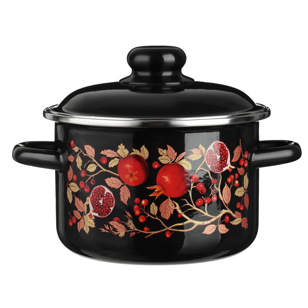 Эмалированная кастрюля Гранат, объем 2 л, с крышкой – это посуда для приготовления первых блюд и компотов, изготовленная из качественной нержавеющей стали с надежным экологичным эмалированным покрытием. Имеет стильный дизайн в черном цвете с красочным изображением граната, будет актуально смотреться в любом интерьерном стиле. Кастрюля обеспечивает равномерное приготовление блюд, устойчива к деформации при длительном нагреве. Эмаль не искажает вкус продуктов, поэтому посуда подходит для хранения готовой еды. Подходит для всех типов плит, включая индукционные.