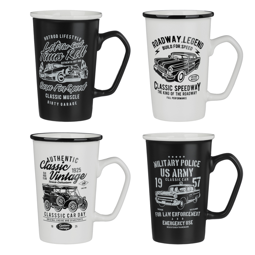 Кружка «Ретро» тм MILLIMI, объем 410 мл – это прекрасный выбор для повседневного чаепития дома и на работе, а также прекрасный запоминающийся и практичный подарок для мужчины. Принт, вдохновленный ретро-эстетикой, смотрится строго и стильно, а базовая черно-белая цветовая палитра прекрасно вписывается в любой интерьерный стиль. Кружка имеет нестандартную вытянутую форму с геометрической ручкой. Качественный фарфор выдерживает интенсивное использование, не требует специального ухода и долго сохраняет температуру напитка, позволяя наслаждаться неспешным чаепитием во время отдыха или работы. 4 дизайна в ассортименте.