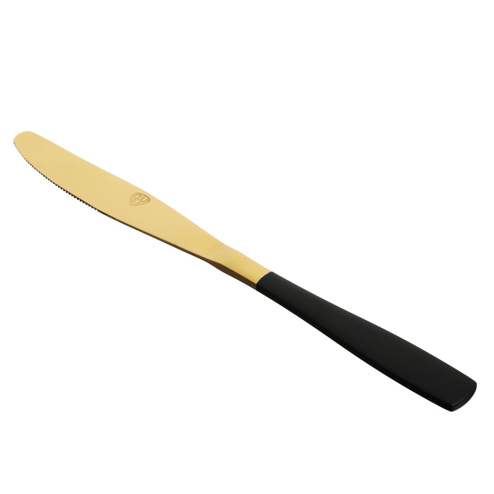 Столовый нож SATOSHI Talinka – это элегантный прибор для торжественной сервировки. Сочетание черной матовой рукояти и золотого лезвия смотрится роскошно и изысканно, превращая нож в яркий акцентный элемент сервировки. Изделие из нержавеющей стали имеет высокую прочность, устойчивость к деформации и к коррозии. Эргономичная ручка обеспечивает удобный хват, а зубчатое лезвие гарантирует легкое и аккуратное разрезание блюд и не требует заточки. Идеальный выбор для тех, кто ценит премиальный дизайн и безупречное качество. Для создания гармоничного единого стиля сервировки комплект можно дополнить другими столовыми приборами из одноименной коллекции.