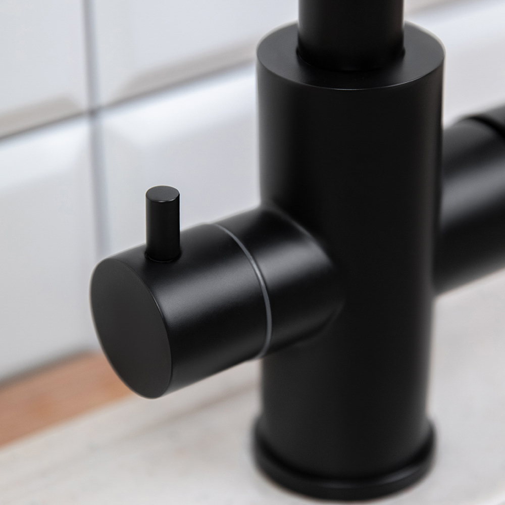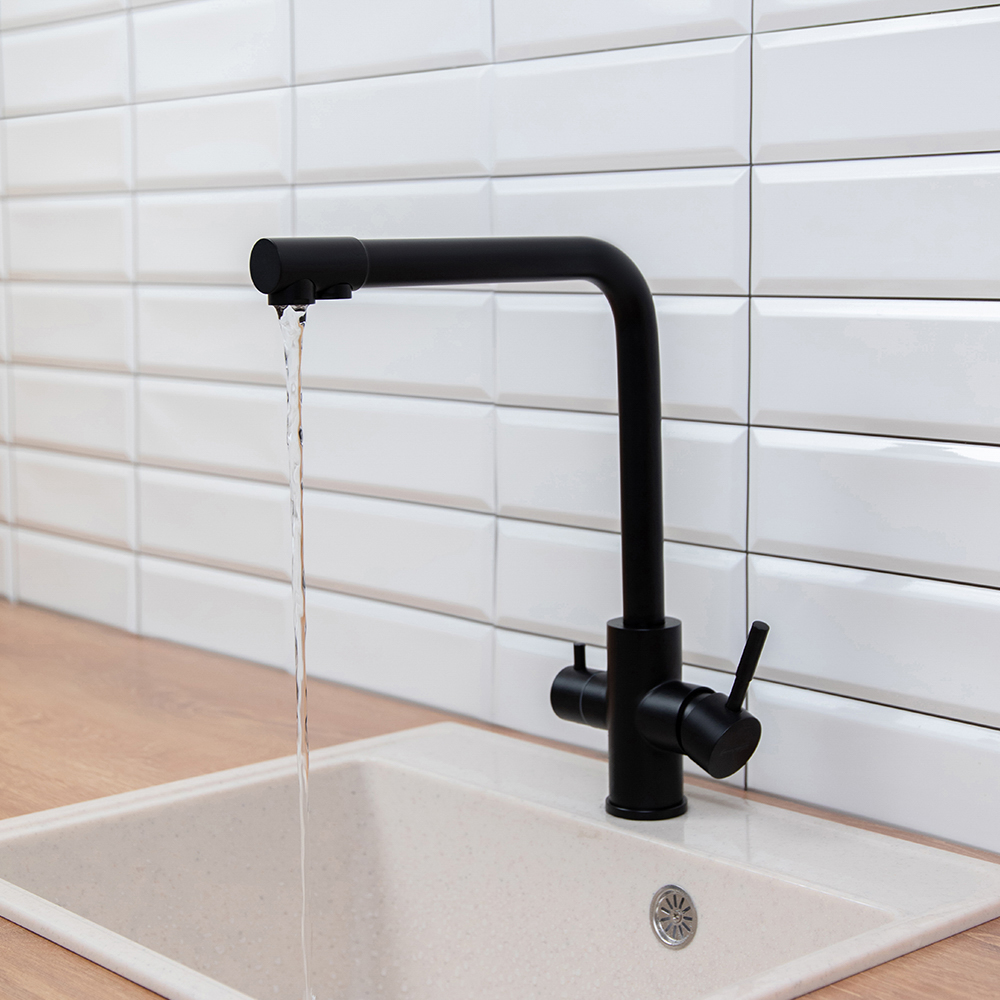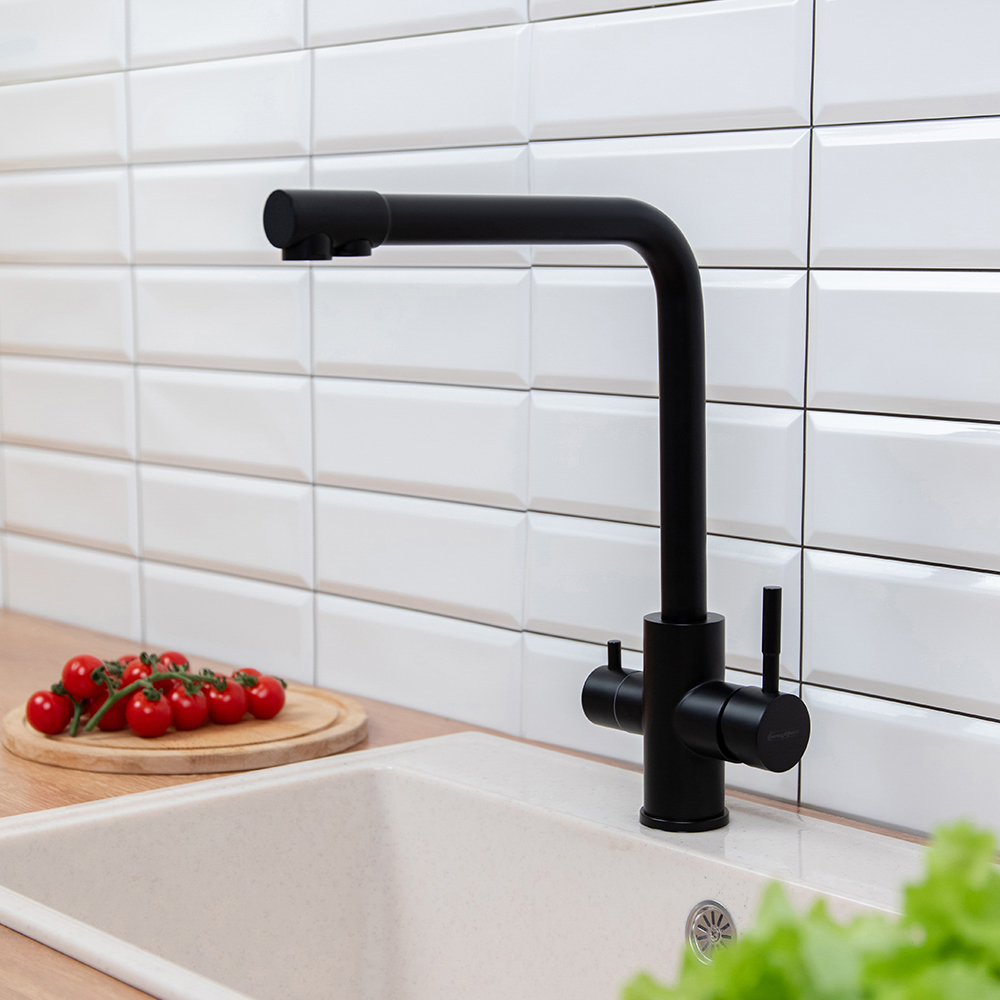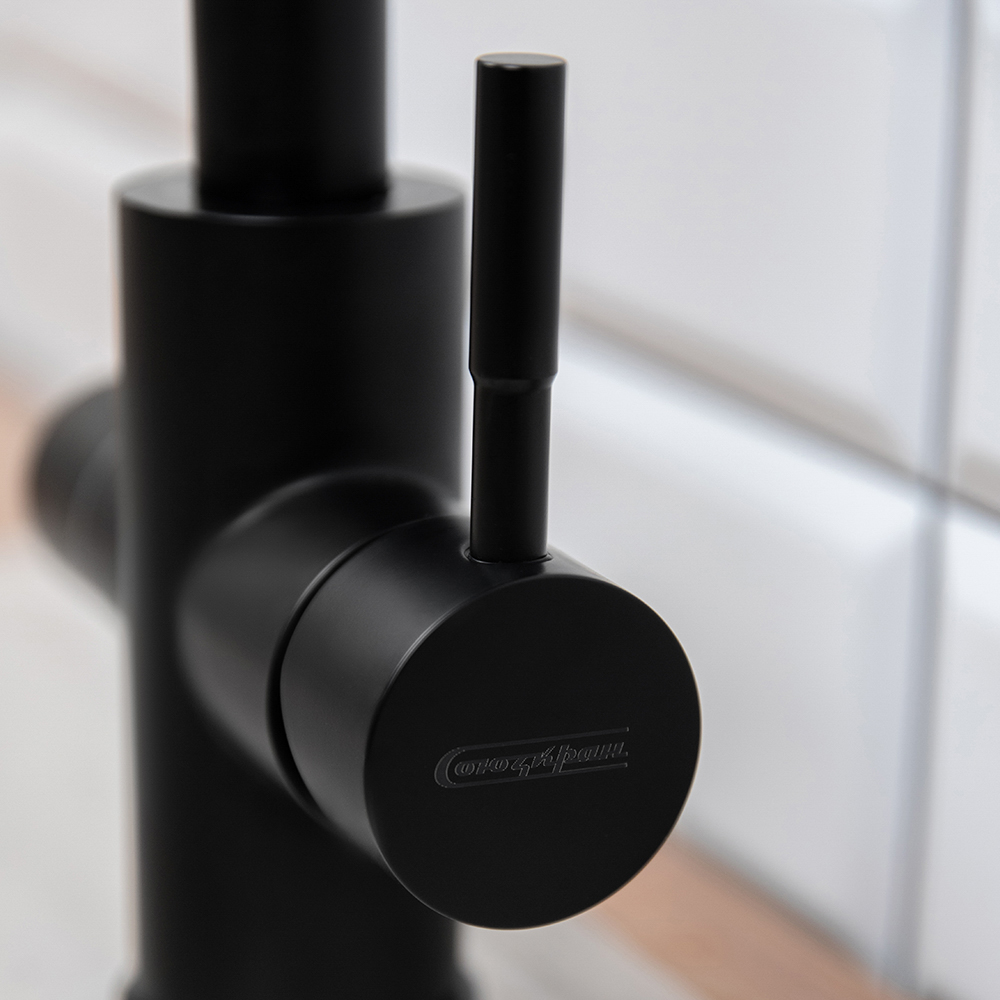 Смеситель для кухни СоюзКран сочетает в себе стильный дизайн и удобство использования. Выполненный из прочной нержавеющей стали, он надежно защищен от коррозии и механических повреждений. Черное покрытие придает изделию современный вид, который гармонично дополнит любой интерьер. Высокий излив (31 см) обеспечивает удобство при использовании, а встроенный вывод для питьевой воды позволяет подключить фильтр, улучшая качество воды. Смеситель оснащен керамическим картриджем диаметром 35 мм, который гарантирует долговечность и плавное регулирование. Надежное крепление с гайкой обеспечивает легкую установку и прочное удержание на месте.