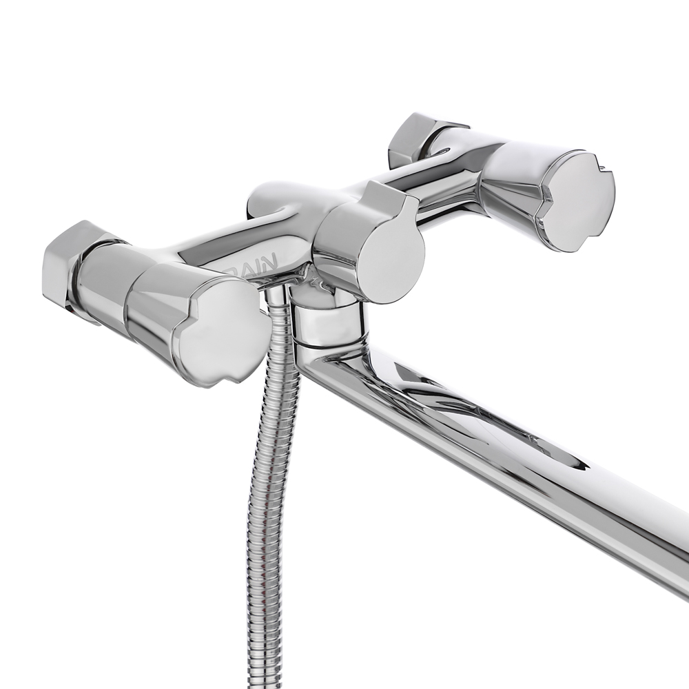 Смеситель для ванны Уран от Rain - это смеситель с душем. Двухвентильный, вентили-овалы. Керамическая кран-букса 1/2" - не ржавеет, дает плавный ход вентилей. Кран-буксу легко заменить самостоятельно. Прямой излив длиной 30 см - удобно набирать воду в ванну, ведра, тазы. Смеситель из латуни - не ржавеет, не боится перепадов температуры воды, не выделяет вредные вещества. Хромированный. Лейка душа с одним режимом подачи воды. Кран-букса чувствительна к качеству воды - используйте фильтры, чтобы она прослужила дольше. Продукция бренда RAIN - это сочетание современных технологий, первоклассных материалов и привлекательной цены.