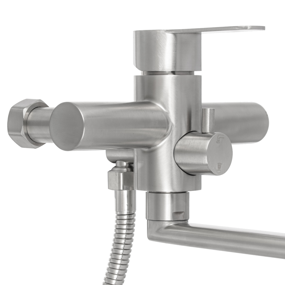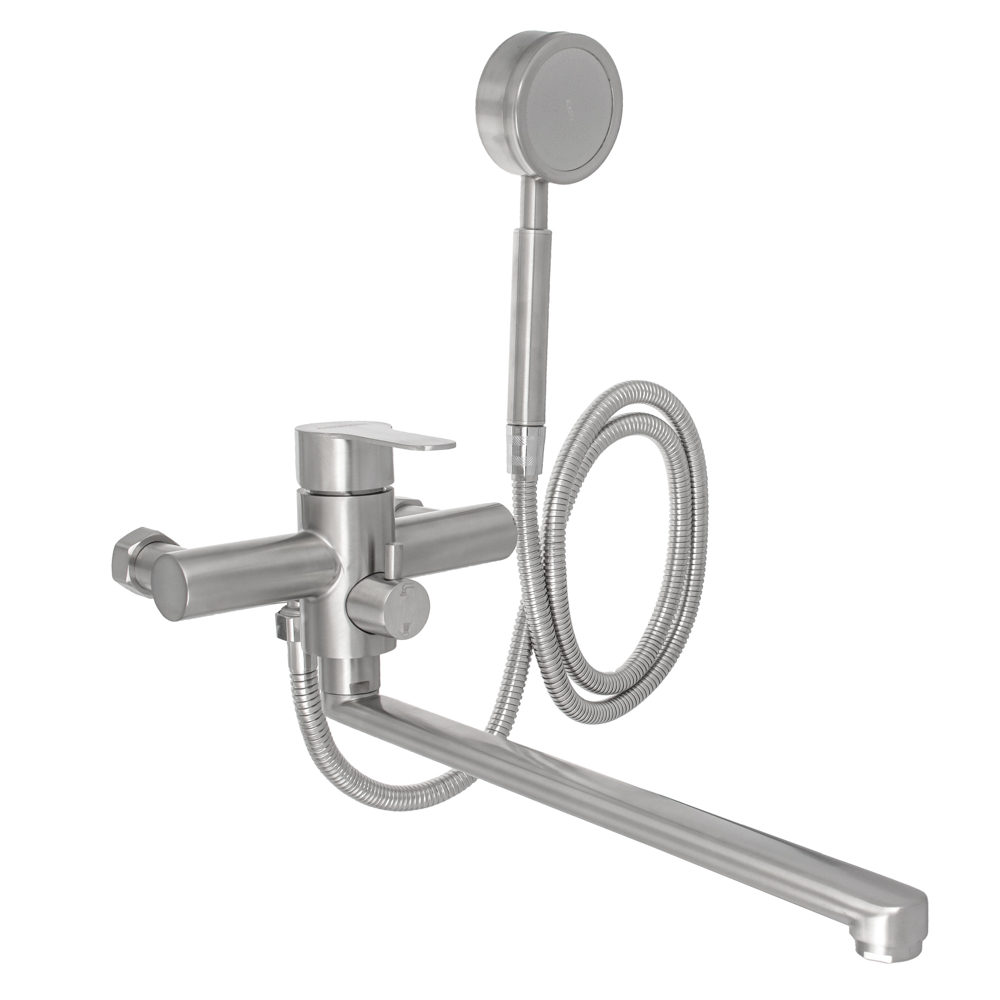Однорычажный смеситель в ванную с длинным изливом устанавливается на стену ванной с помощью горизонтальных креплений. Керамический картридж 40 мм позволяет регулировать напор воды одной рукой мягко и плавно, его конструкция обеспечивает прочность соединений и долговечность работы. Пластины из металлокерамики, отшлифованные ультразвуком, плотно прилегают друг к другу, механизм не содержит резиновых прокладок. Плоский гусак поворачивается в любую сторону, его длина составляет 35 см, что позволяет использовать его и для раковины, и для умывальника. В комплект включены: смеситель, комплект креплений с отражателями, шланг с лейкой и держателем. Смеситель изготовлен из прочной нержавеющей стали, устойчивой к коррозии. Ванная комната – это место, где мы проводим время каждый день, поэтому ее дизайн и комфорт очень важен. Сантехника стального цвета прекрасно вписывается в любой интерьер. Отличие этой модели – покрытие сатин, шероховатое с легким блеском.