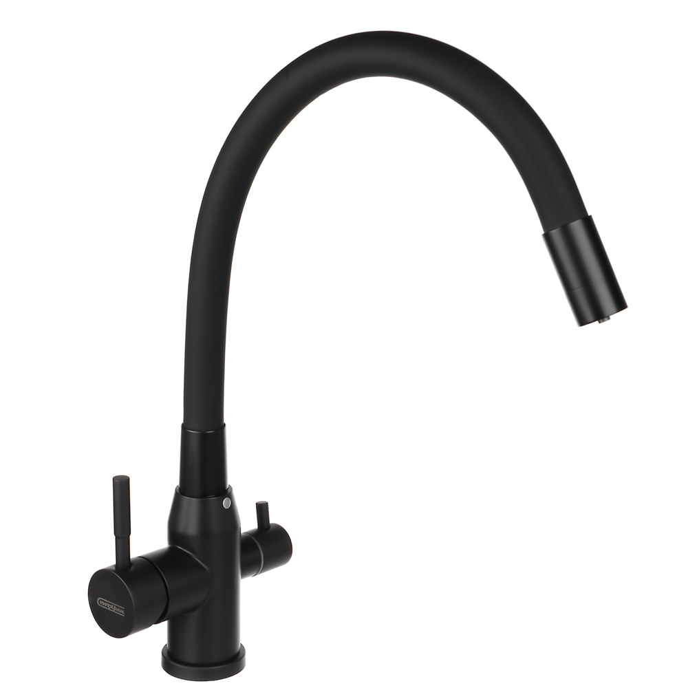 Смеситель для кухни СоюзКран с выводом питьевой воды и силиконовым изливом – это современный сантехнический прибор из высококачественной нержавеющей стали, рассчитан на длительный срок эксплуатации и не подвержен коррозии. Имеет стильный дизайн в черном цвете, который добавит эстетики в интерьер кухни. Благодаря отдельному выводу для питьевой воды не потребуется устанавливать дополнительный кран. Силиконовый излив добавляет комфорта во время использования смесителя: гибкий кран можно регулировать во все стороны, а также по высоте.