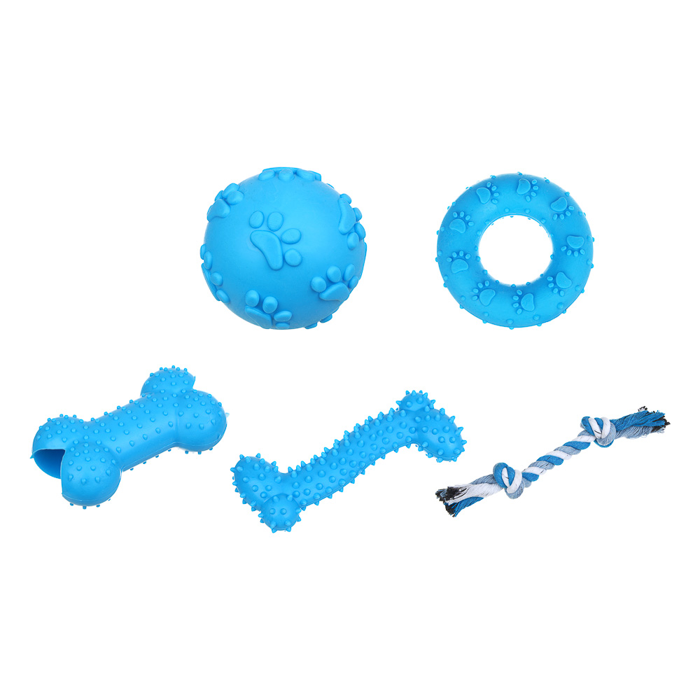 Набор игрушек для домашних животных VETTA из термопластичной резины и хлопчатобумажной веревки включает 5 игрушек для собак в виде кольца, мяча, костей и веревки. Подходит для игр дома или во время выгула, а также для дрессировки. Игрушки изготовлены из прочных безопасных износостойких материалов, не повреждаются от зубов собаки, хорошо сохраняют форму и имеют оптимальный размер, что исключает риск случайного проглатывания. Выпуклые элементы массируют челюсть. Толстая веревка очищает зубы, тренирует челюсть, а также развивает охотничий инстинкт.