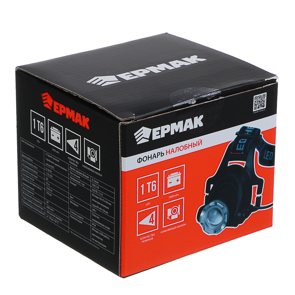 ЕРМАК Фонарь налобный, 1 T6 LED, с фокусировкой, 2*1200мАч, 4 режима, пластик, 70х75х50 мм