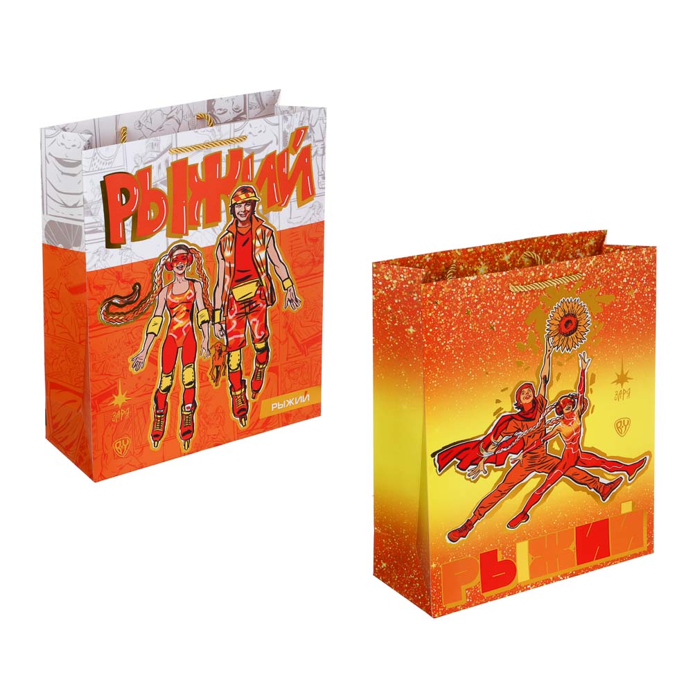 РЫЖИЙ Пакет подарочный из высококач. бумаги с фольгированным слоем, 26х32x10 см, 210 гр., 2 дизайна